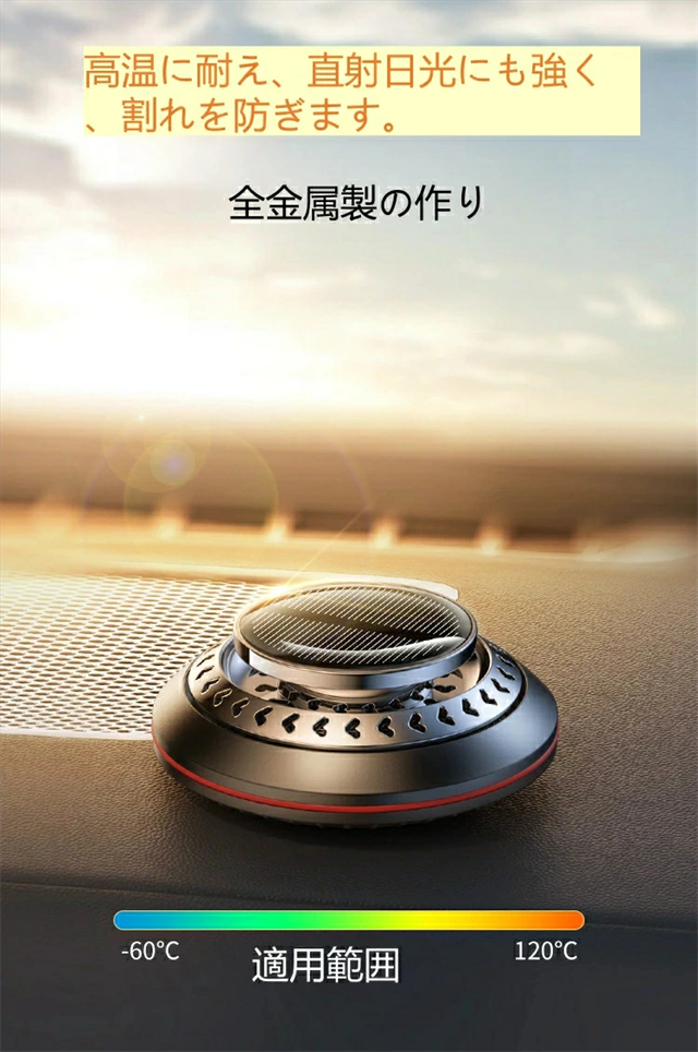 ・ソーラーパネルを使って、太陽光で自動回転しながら香りを広げます。充電は不要で、光があれば香りを自然に拡散してくれます。