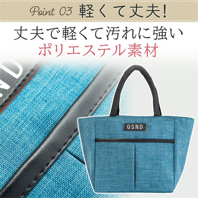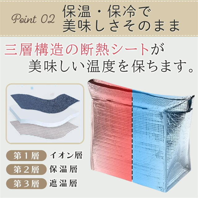 メインの収納場所とは別にフロントに大きめのファスナーポケットを設置しているため、食材以外にもカトラリーや食器などの小物類を収納しやすい、また両サイドの網ポケットには携帯、モバイルバッテリー、財布なども収納でき、出掛ける時必要なものが1つのバッグに収まります。そして食べ物や飲みものをこぼしてもきれいに拭き取れる生地を採用しており、お手入れも簡単です。