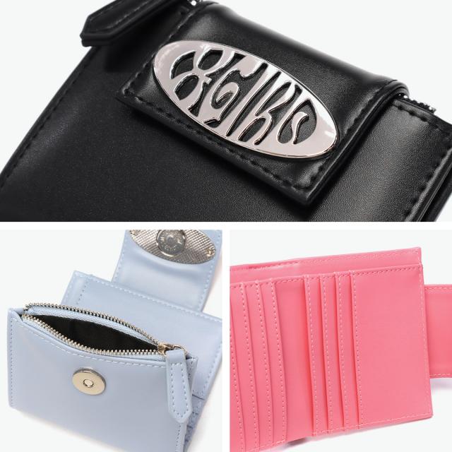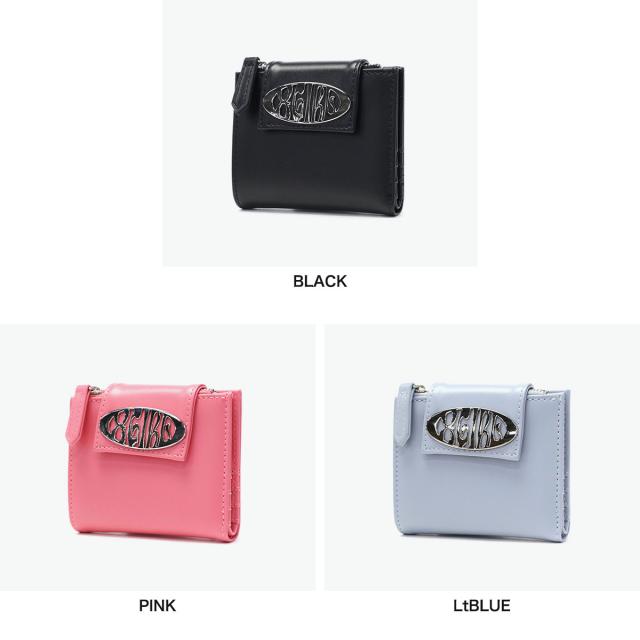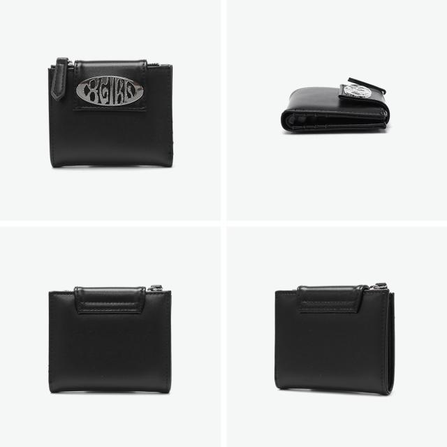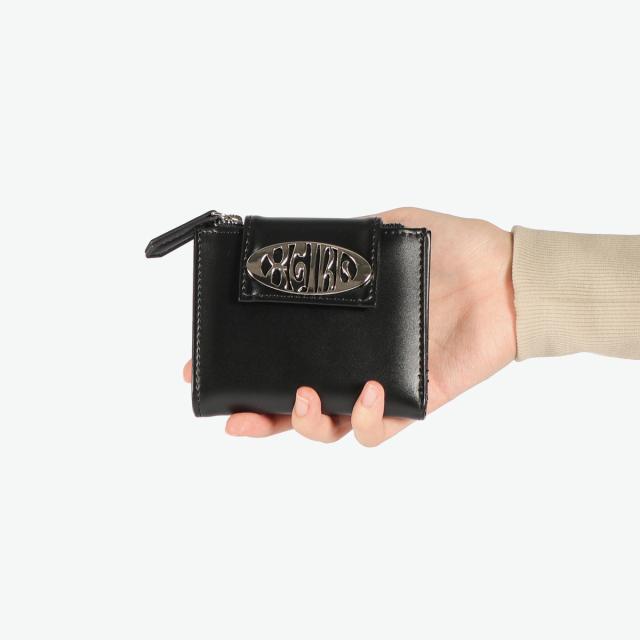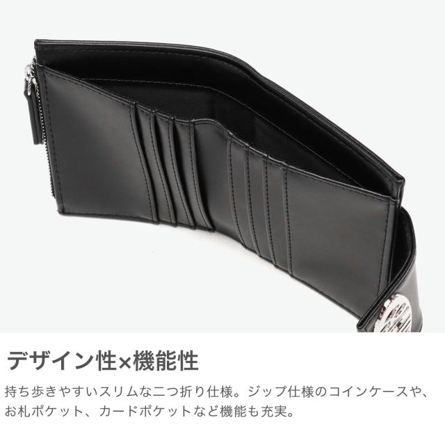 スリムな財布をお探しの方におすすめのミニ財布。持ち運びに便利な薄型二つ折り仕様で、ジップ付きのコインケースやお札ポケット、カードポケットなど収納力も充実しています。フェイクレザーに映えるメタリックなロゴバックルがアクセントになり、デザイン性と機能性を兼ね備えたアイテムです。