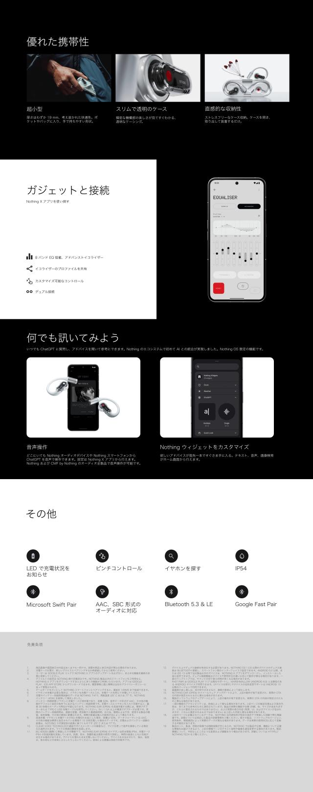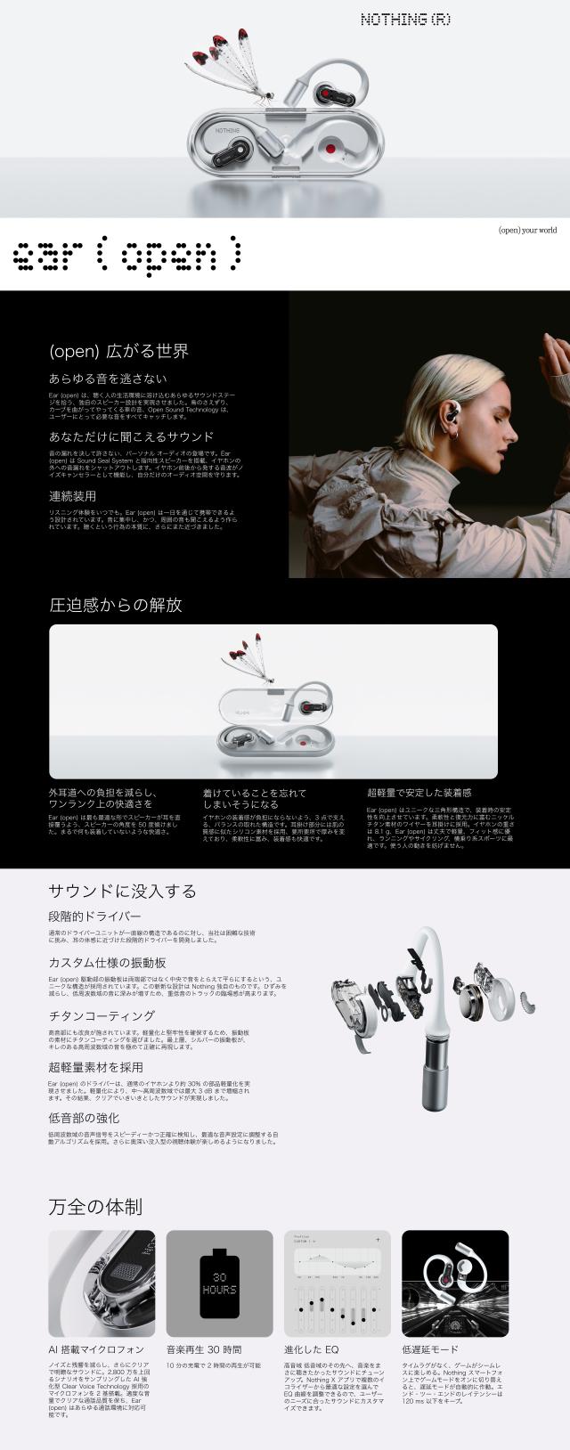| ブランド |NOTHING 商品名 |Ear (open) カラー |ホワイト サイズ |幅 51.3 x 高さ 41.4 x 奥行 14.3mm(本体) / 幅 125.9 x 高さ 44.0 x 奥行 19.0mm(充電ケース) 重量 |約 8.1g(本体) / 約 63.8g(充電ケース) 対応コーデック |AAC、SBC ドライバー | 14.2 mm ダイナミックドライバー ダイアフラム | チタンコーティング、ポリエチレンテレフタラート 搭載音声技術 |Open Sound Technology、AI 強化型 Clear Voice Technology 音声チューニング |Nothing カスタム マイク |AI強化型Clear Voice Technology採用のマイクロフォン 2基 バッテリー |64mAh(各イヤホン) / 635mAh(充電ケース) バッテリー駆動時間 |再生(イヤホン 8時間 | イヤホン+ケース 30時間)、通話(イヤホン 6時間 | イヤホン+ケース 24時間) 充電 | 10 分の充電で 2 時間の再生が可能 充電方式 | USB Type-C 通信規格 | Bluetooth 5.3 Bluetoothプロファイル |RFCOMM, SPP, HFP, A2DP, AVDTP, AVCTP, AVRCP 防水防塵 |IP54 ペアリング |Google Fast Pair、Microsoft Swift Pair 防水防塵 |IP54 アプリ |NOTHING X (iOS 13以降、Android 5.0以降) ※日本語対応 その他の機能 |IP 定格、ピンチコントロール、デュアル接続、充電状態を示すLEDライト、低遅延モード パッケージ内容 |イヤホン本体、充電ケース、USB Type-Cケーブル、ユーザーガイド、安全に関する情報と製品保証についてのお知らせ 持続可能性 |ライフサイクル全体のカーボン フットプリント:3.0 kg CO2e、スズはんだペーストは100%リサイクル、組み立て最終工程には100%再生可能エネルギーを使用 |