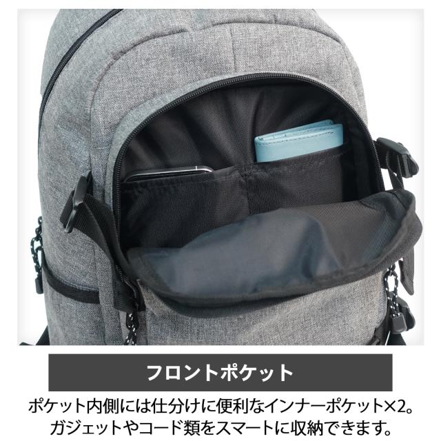フロントのポケットには仕分け用のインナーポケットが付いており、ガジェットや小物類をすっきり収納できます。