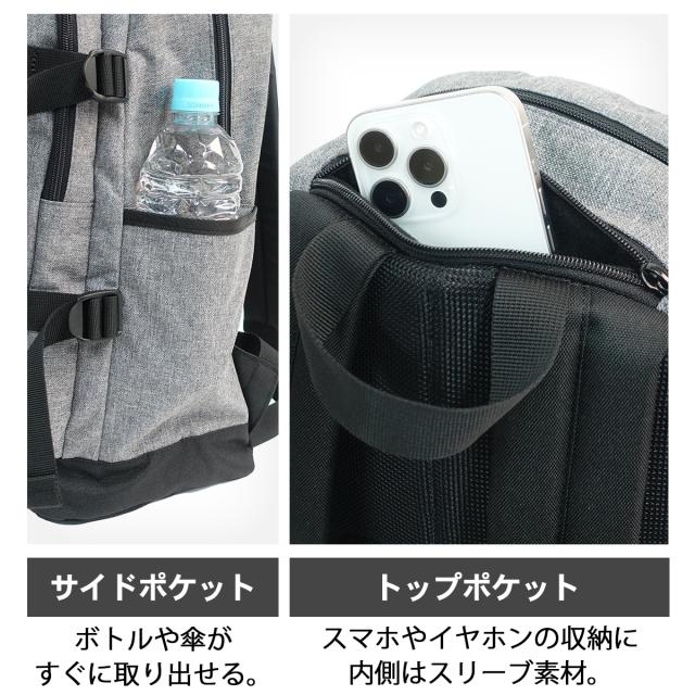 サイドにはボトルや折りたたみ傘が収納できるポケット、上部にはスマホやイヤホンの収納に便利なトップポケットを備えています。
