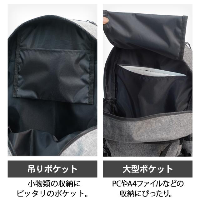 メインルームにはPCスリーブと吊りポケットも内蔵しており、通勤・通学にも対応した機能性を備えています。