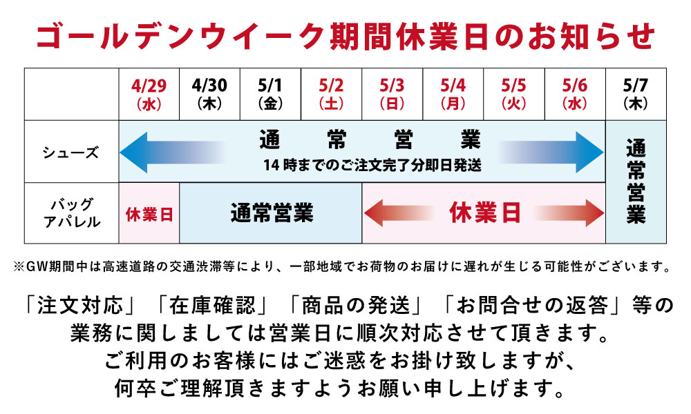 【GW期間中の出荷について】 ■シューズ:通常通り(14時までのご注文で当日発送) ■バッグ・アパレル:4/29・5/2〜5/6休業