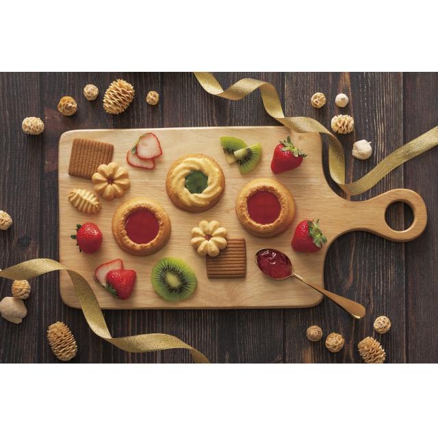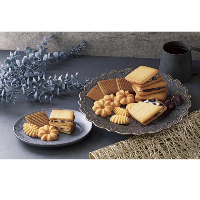 二度焼した2種類のクッキー生地に、フルーツジャムでデコレーションした素朴で懐かしい「ベイクドクッキー」やさっくりと焼き上げたサブレ生地に、ラム酒のシロップに漬け込んだ柔らかなレーズンとくちどけなめらかなホワイトクリームをサンドした「レーズンサンド」、素材の持ち味を生かして焼き上げた、上品な味わいのクッキーの詰合せ。