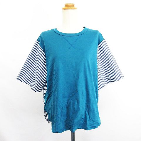 【中古】ハッシュパピー カットソー 五分袖 丸首 ストライプ LL グリーン×ネイビー×ホワイト ※EKM レディース
