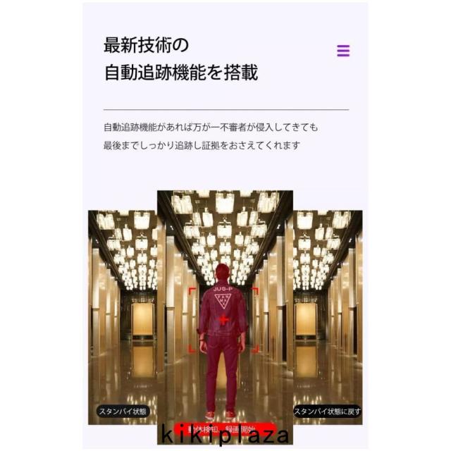 機能:遠隔監視、ビデオ撮影、2.4GWiFi対応、スマホ対応、赤外線暗視機能、動体検知、自動追跡、長い時間稼働、166°広角監視、1080P、音声記録