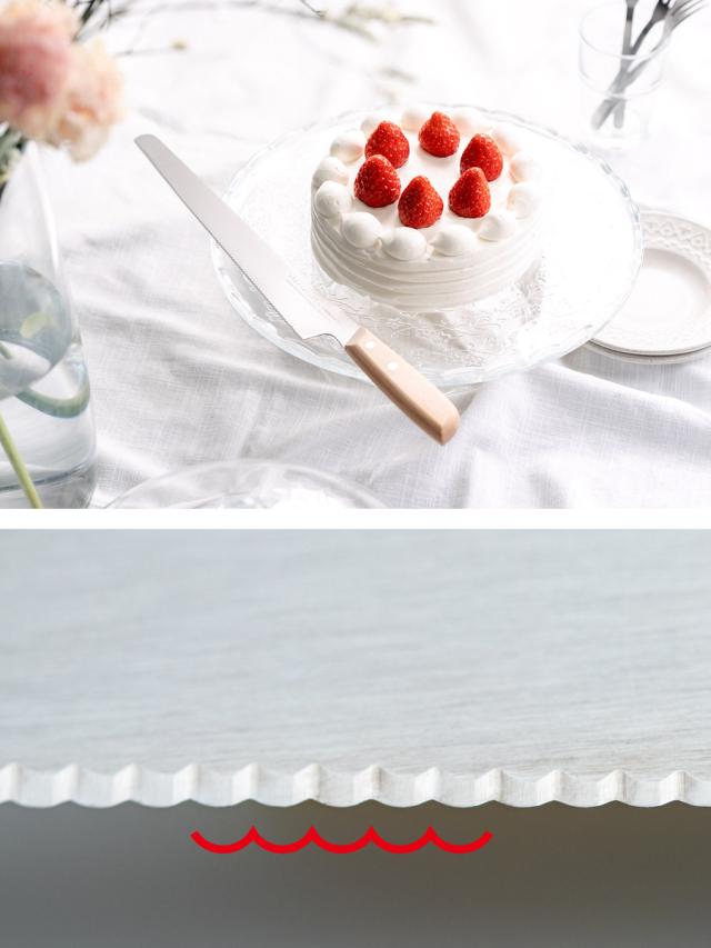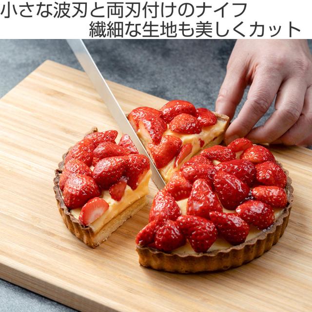 繊細な生地を美しく切り分けるための工夫が詰まったジェノワーズナイフです。山なりの丸い形が連続する波刃なので、繊細な生地をひっかけることなくスムーズにカットできます。