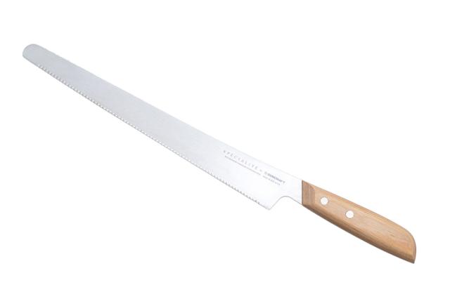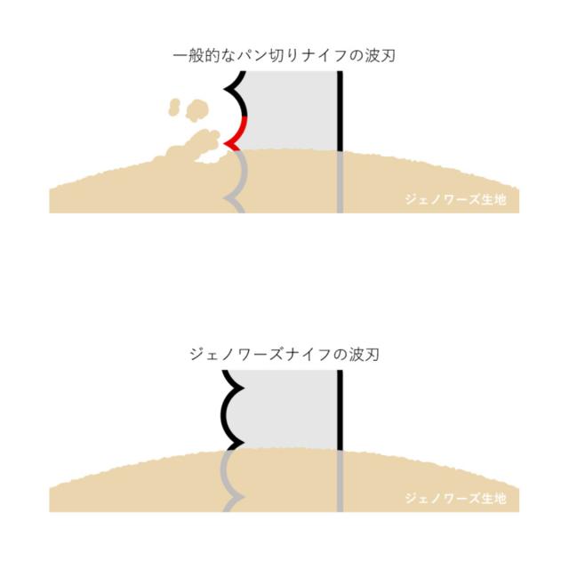 一般的なパン切りナイフは、鋭い形の波刃で力強く食材に切り込みますが、ジェノワーズナイフは抵抗が少なく柔らかなケーキ生地を傷つけないようにカットできます。