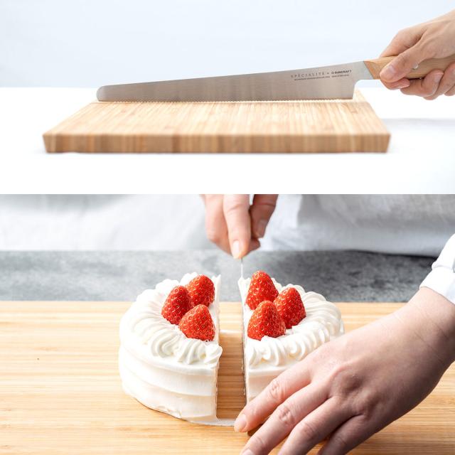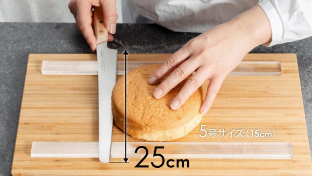 刃渡りは約25cmで、ケーキ作りの基本サイズ・直径15cmの5号ケーキに最適な長さです。大きなストロークでケーキをスライスできるため、断面も美しく仕上がります。