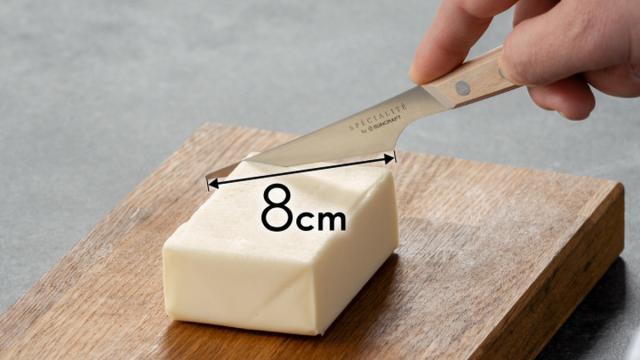 刃渡りは約8cmなので、200gのブロックバターの切り出しにちょうどいいサイズです。