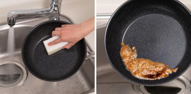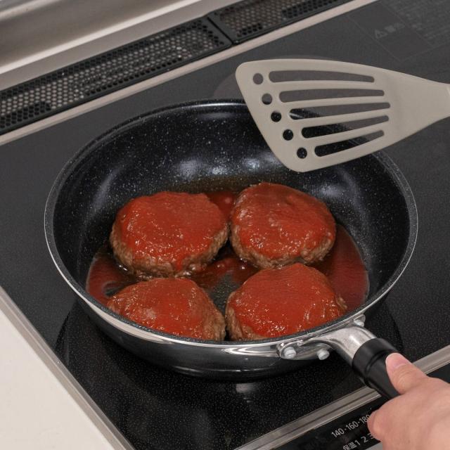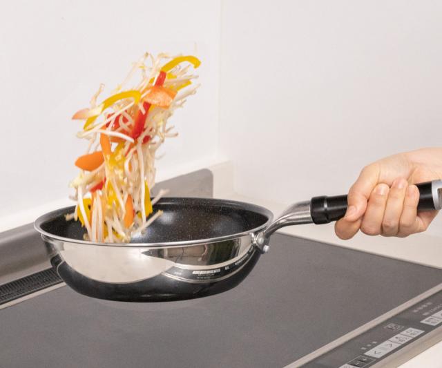 底面は分厚い作りになっているため、熱によって変形しにくく、フライパンが長持ちします。IHでの高温調理でも安心して使える設計です。