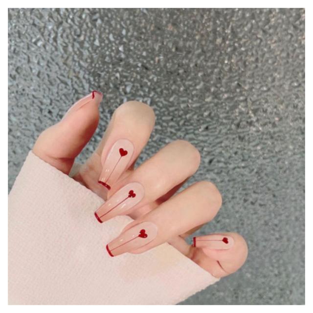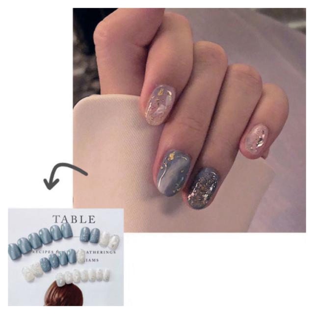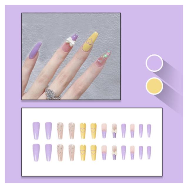 | サイズについての説明 | ☆使用方法☆1. 爪をリムーバーなどでキレイにして乾燥します。2. 爪にあったサイズを選んでください。3. つけ爪の裏面に少量の接着剤をつけ、 爪の根元にあわせて置き、13秒程度押し付けます。【はずし方】ステックなどを側面から差込み、ゆっくりはがします。ネイルグルーリムーバーをしみ込ませると効果的です。 |