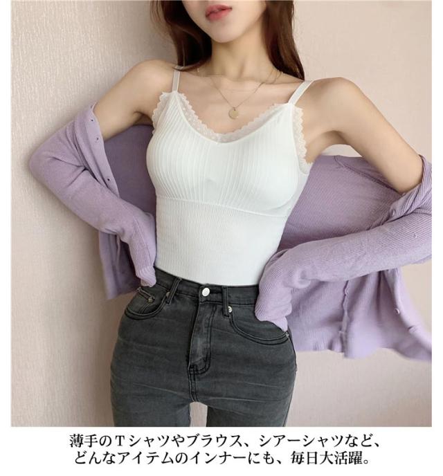 | 肩紐周りのレースが可愛い カップ付キャミソール レースをあしらったフェミニンなキャミソール。チラ見えしても可愛い一枚です。 伸縮性に優れているので、締め付けすぎず、ストレスのない着心地です。 しっかりアンダーを支える作りなので、残念バストになりがちなカップ付きキャミでも美胸を作ります。 インナーとしても、見せるインナーとしても大活躍間違いなしのアイテム◎ 薄手のTシャツやブラウス、シアーシャツなど、どんなアイテムのインナーにも、毎日大活躍。 | |