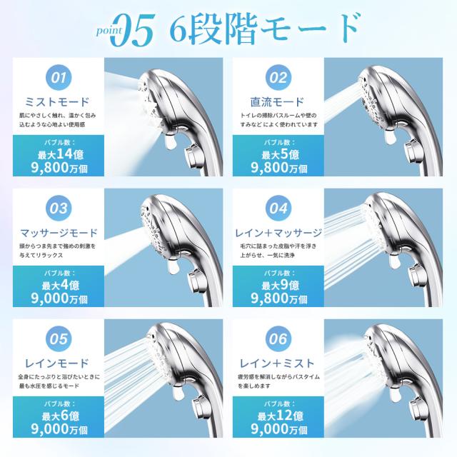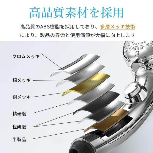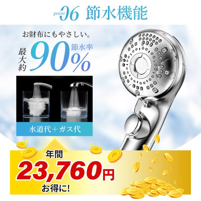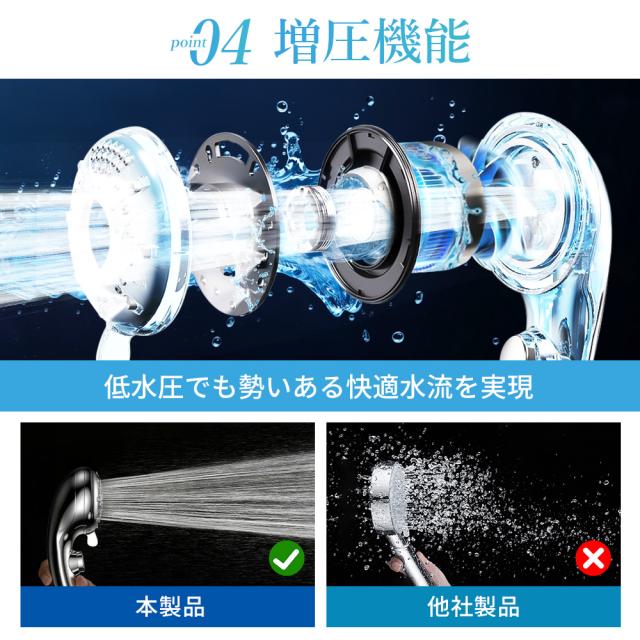 ミスト美肌モード、レインャミストモード、レインモードがございまして、ニーズによってモードを選べます!また、抜群な増圧効果で、少量の水でも勢いのある水流を供給でき、水の使用量を大幅に節約できます。水道代だけでなく、お湯を沸かすときに湯沸かし器に使うガス代や電気代なども節約できます。