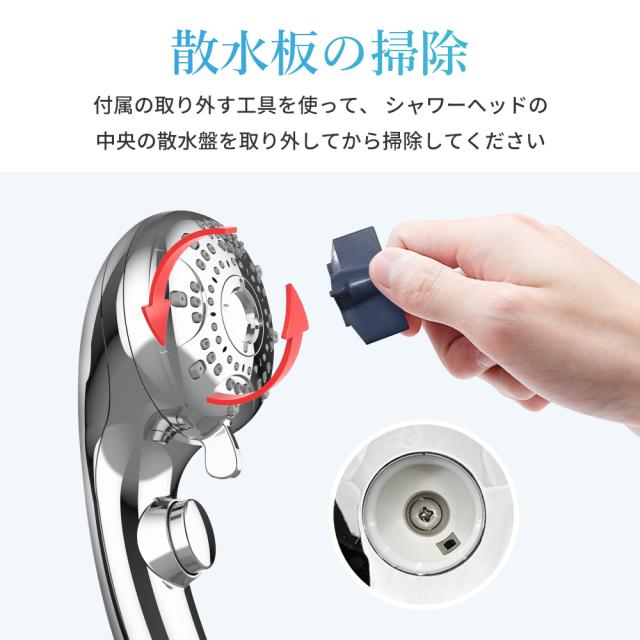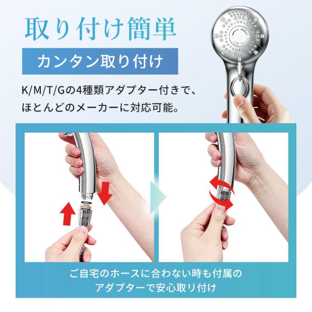 国際標準G 1/2インタフェースで、工具を使わず、ほとんどの家庭用シャワーに取り付けることができます。M/G/T/Kの4種類のアダプター付き、自宅のシャワーヘッド仕様に合わせて簡単に取り付けられます。また、シャワーホールはシリコン制なので、摩擦するだけでゴミ詰まりや軽い汚れが取れます。