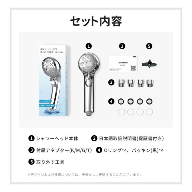 ●セット内容:シャワーヘッド本体、日本語取り扱い説明書(保証書付き)、アダプター*4(M/G/T/K)、Oリンク*4、パッキン(黒)*4、取り外す器具