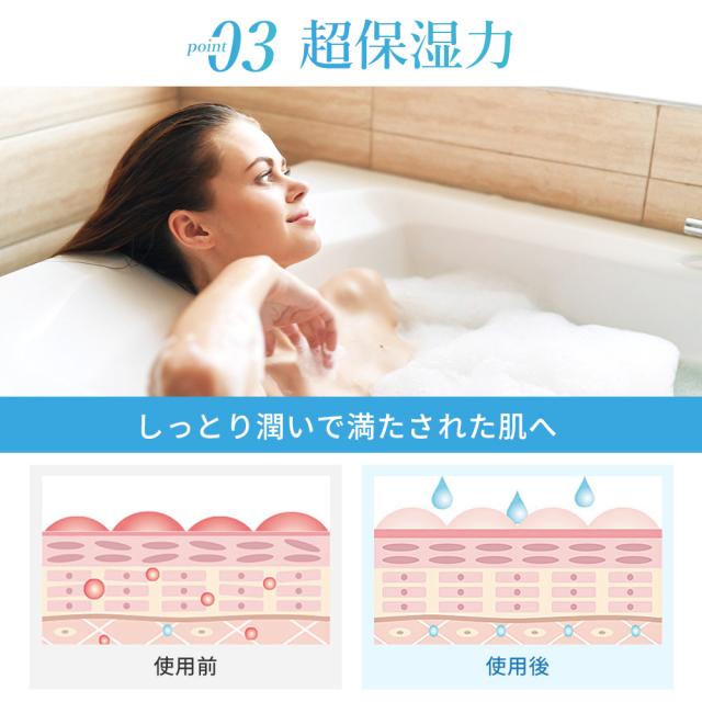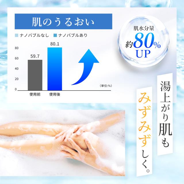 直径1μm以下のマイクロナノバブルが毛穴の奥深くまで浸透し、毛穴内の皮脂や汚れ、ニオイを吸着洗浄します。しかも、髪や肌にしっかりと潤いを与えてくれます。時間が経っても水分量は持続し、肌に潤いが生まれます。乾燥肌や秋冬の乾燥が気になる方におすすめです。敏感肌の方やお子様にも安心です。