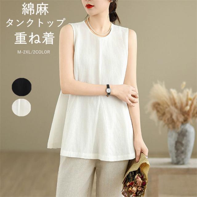 タンクトップ レディース リネン トップス 綿麻 ノースリーブ 重ね着 レイヤード ロング丈 ゆったり 大きいサイズ 着痩せ おしゃれ エレガント 可愛い フォーマル 大人 通勤OL お洒 カジュアル
