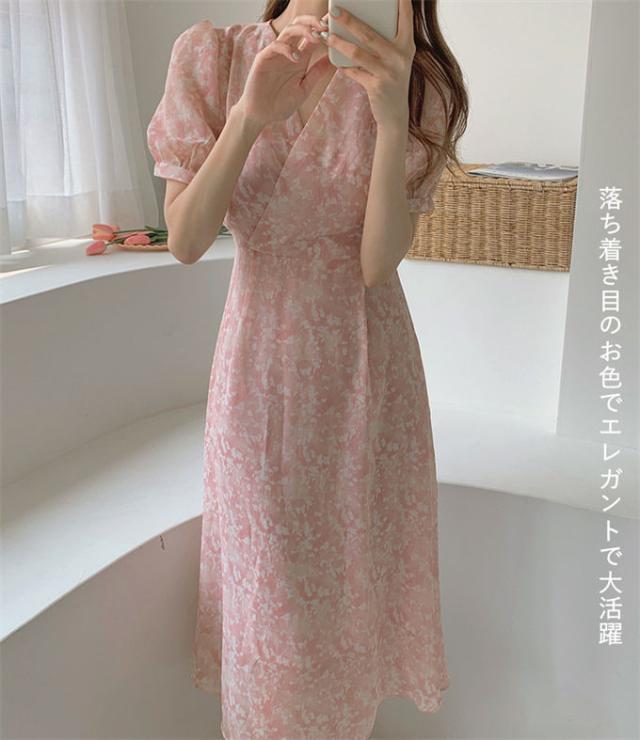 シフォンワンピース ワンピース レディース ロングワンピース 半袖 Vネック プリント 花柄 オフィスカジュアル きれいめ フォーマル パーティードレス 結婚式 フリル おしゃれ 大人可愛い 演奏会
