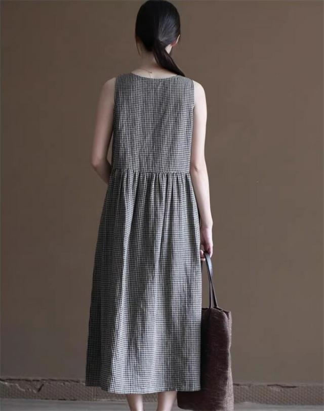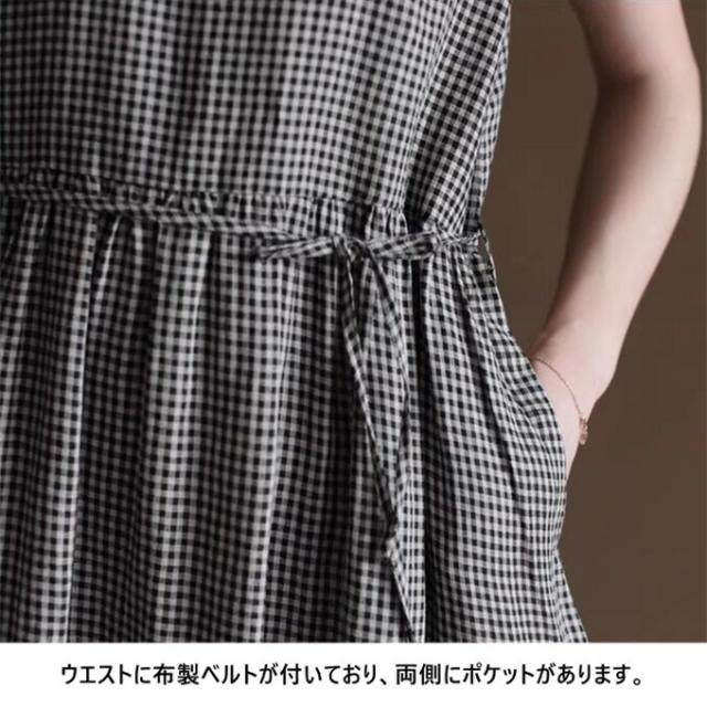 ノースリーブワンピース チェックワンピース ロングワンピース ワンピース ノースリーブ クルーネック ポケット付き フリル 綿麻風 カジュアル チュニック ゆったり おしゃれ キレイめ 大きいサイズ