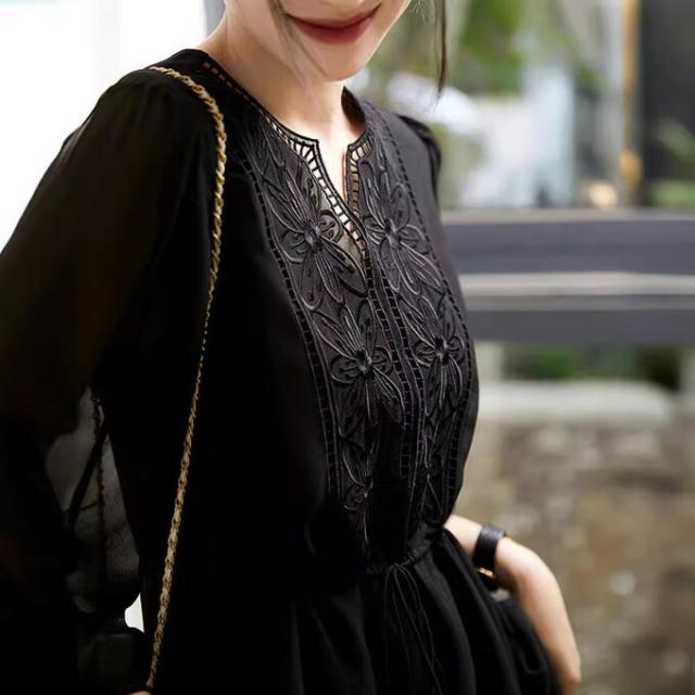 ロングワンピース レディース 長袖 刺繍 ワンピース フレアワンピース ウエストリボン付き キレイめ マキシ丈 エレガント カジュアル 大人かわいい 上品 結婚式 ドレス 20 フェミニン