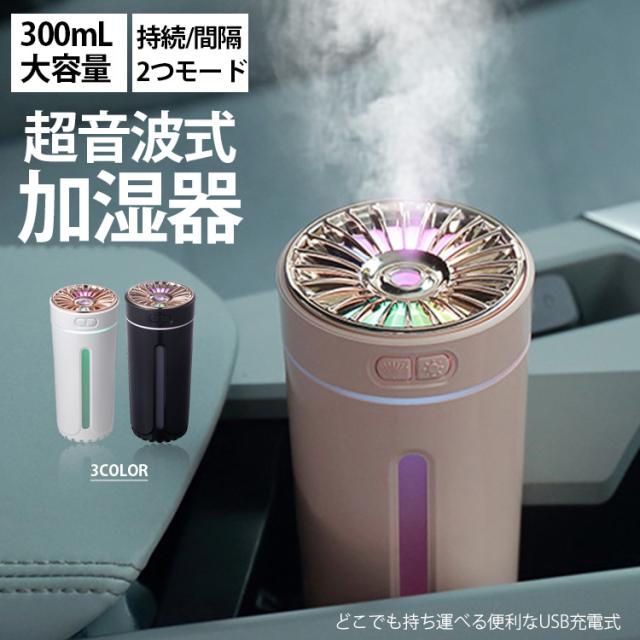超音波 車載加湿器 加湿器 卓上 コードレス 300ML容量 USB-C充電式 卓上加湿器 ミニ加湿器 オフィス 7色ナイトライト 持続噴霧 間隔噴霧 2つモード 車載使用 アロマ 充電式 静音設計 おしゃれ 除菌 空焚き防止