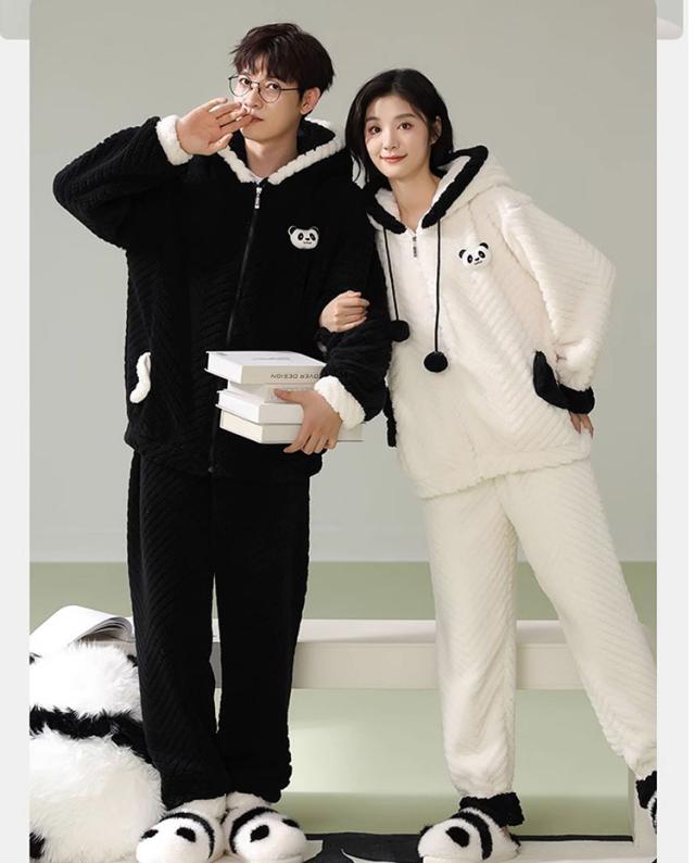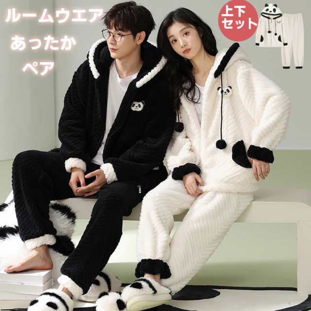 ルームウェア もこもこ ペア レディース メンズ 部屋着 パジャマ フード付き 上下セット ジップアップパーカー ロングズボン フランネル 厚手 あったか 男女兼用 秋冬 部屋着 アニマル パンダ着ぐるみ オシャレ