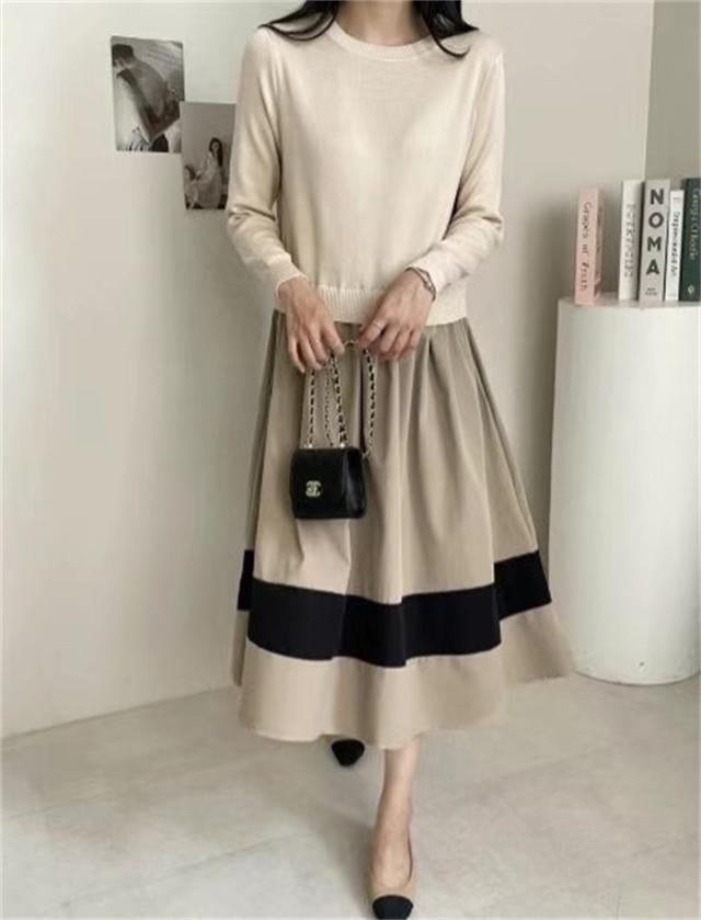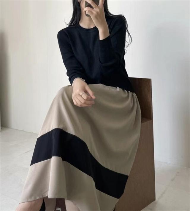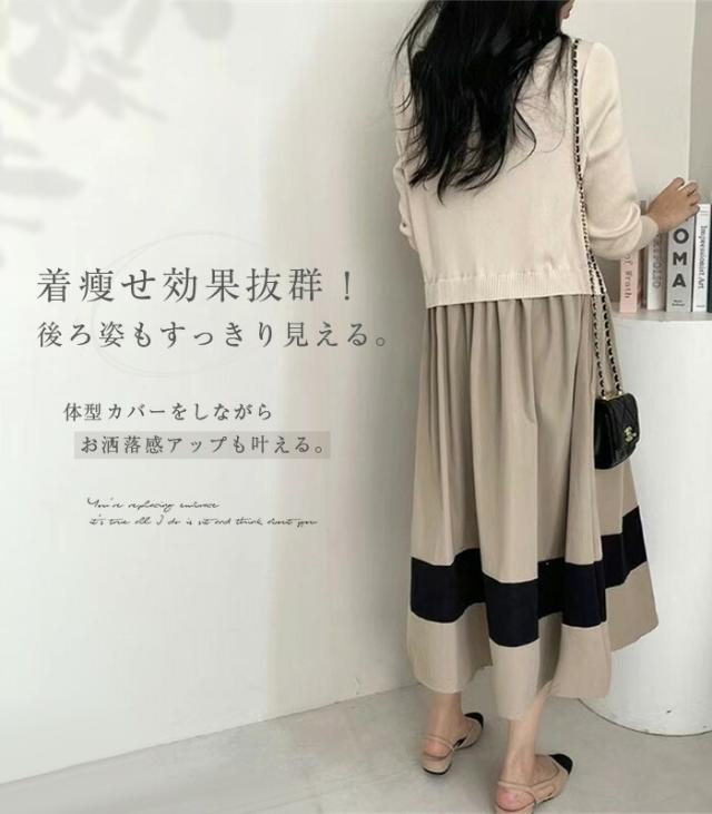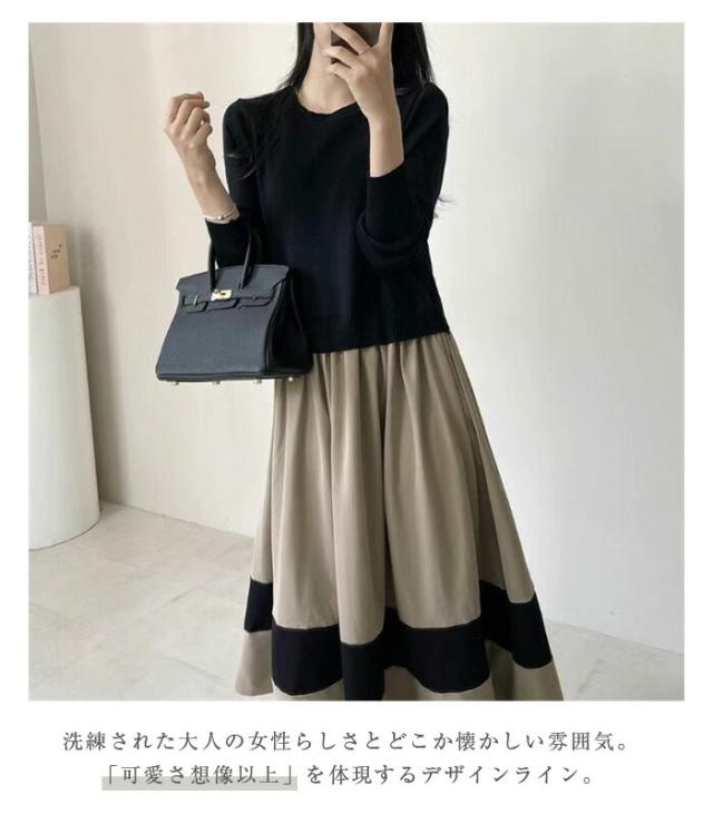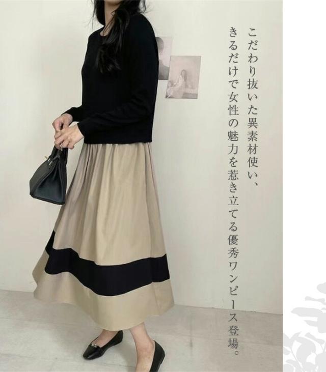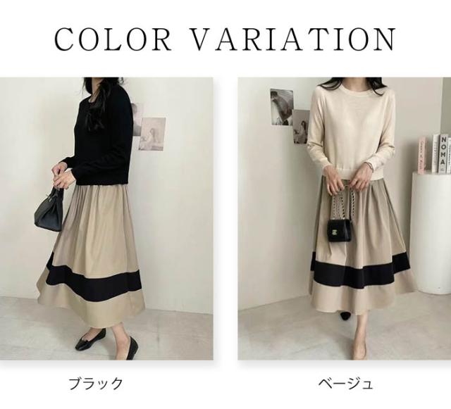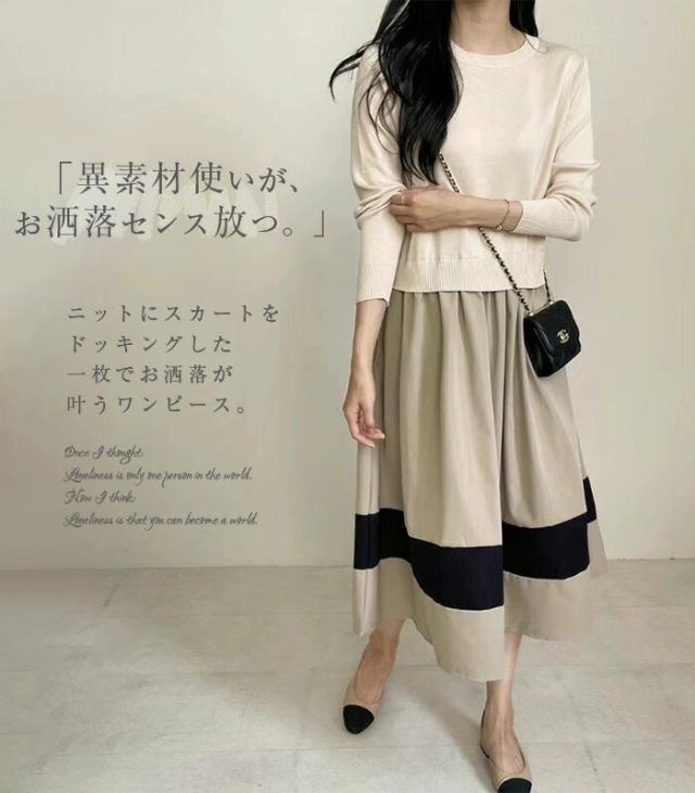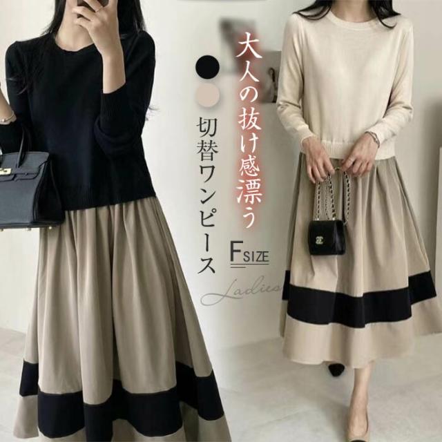 ワンピース 切替 ロングワンピース レディース 異素材 春秋 冬 きれいめ 長袖 ニット ロングワンピ 通勤 マキシ丈 異素材切替 ニットワンピース フレア セーター 着?せ 体型カバー カジュアル オフィス ol レイヤード風 おしゃれ