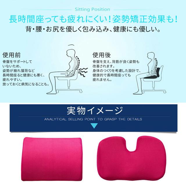 | 商品説明 | 椅子用の背もたれクッションと骨盤クッションのセット ※椅子別売り ウレタン製の低反発ランバーサポート 腰にフィットして、背筋が伸びるので、姿勢矯正や骨盤矯正、猫背矯正にもおすすめ 腰の負担を軽減し長時間座っても疲れない腰用クッション 調整ベルト付きで、さまざまなタイプの椅子にも対応 骨盤座布団クッション 椅子用のシートクッションU字型で長い時間座り続けてもお尻の形を崩さない! イスでも座椅子でもフローリングや絨毯、畳へそのままでもOK カーブのある設計で優しくおしりを包み込み、臀部を圧迫しないため美尻効果も! 姿勢や骨盤のゆがみ矯正グッズとしてもおすすめ メッシュ素材のカバー付きで通気性も抜群 チャック式で取外しも簡単で洗濯可能 |