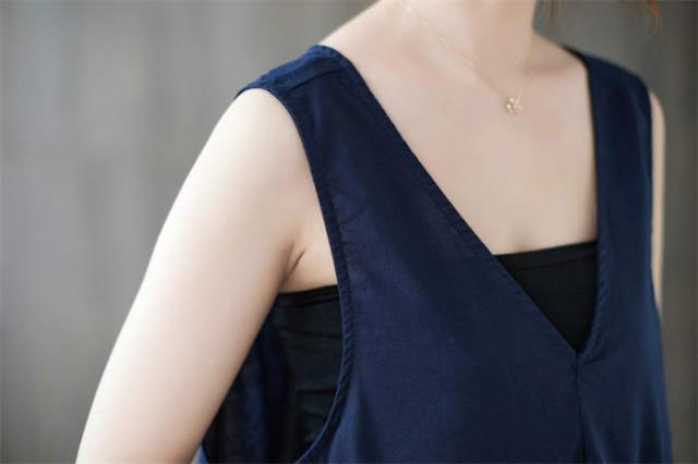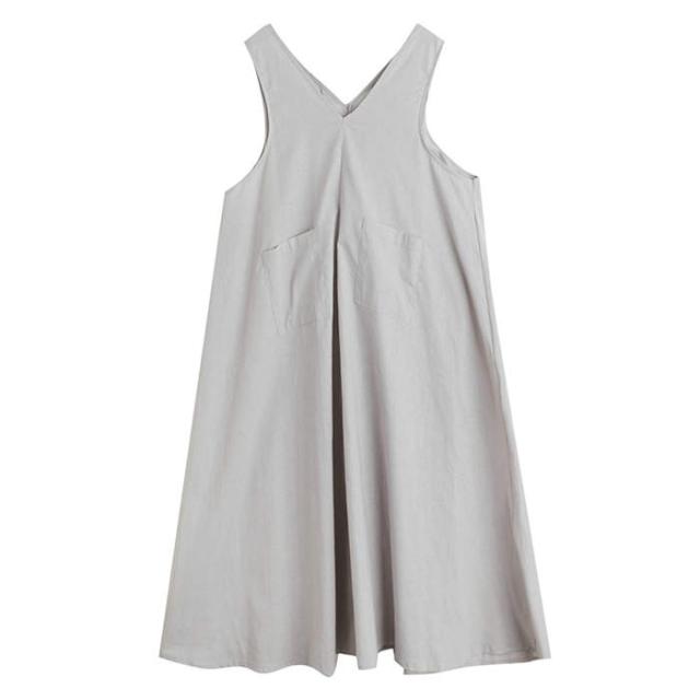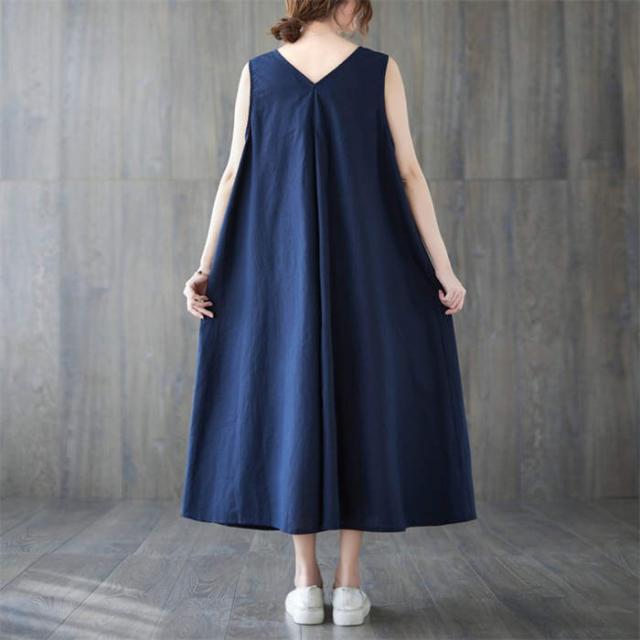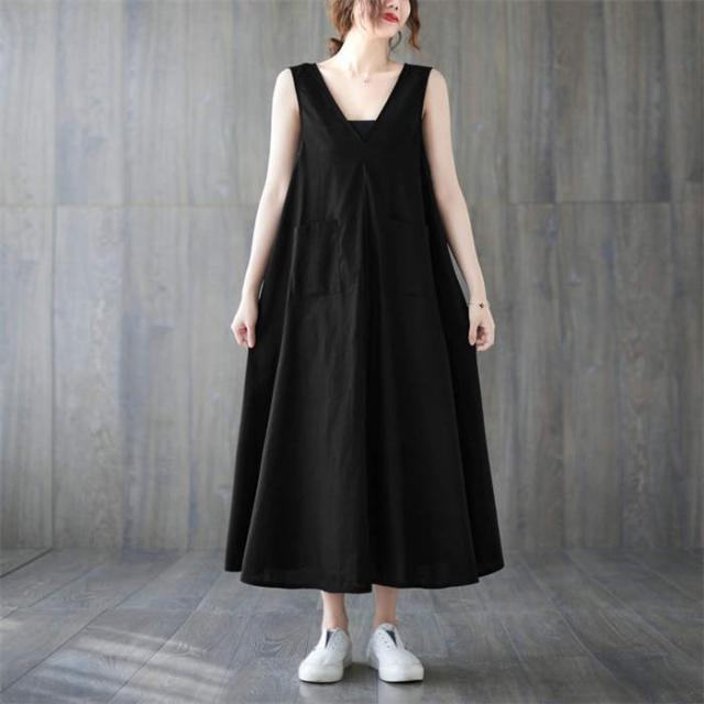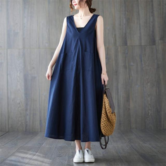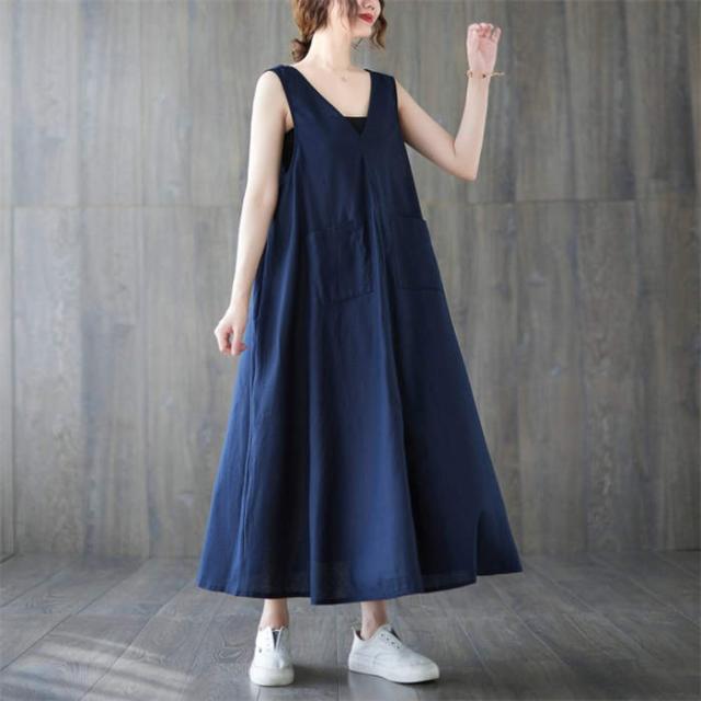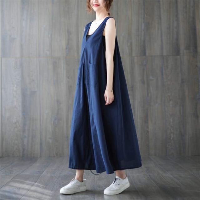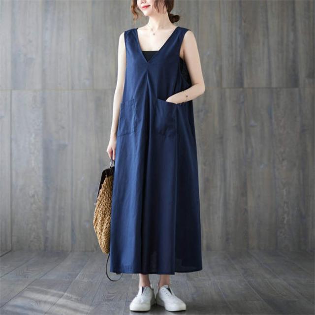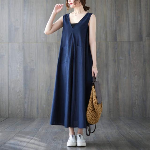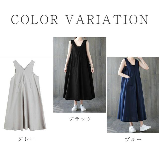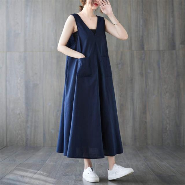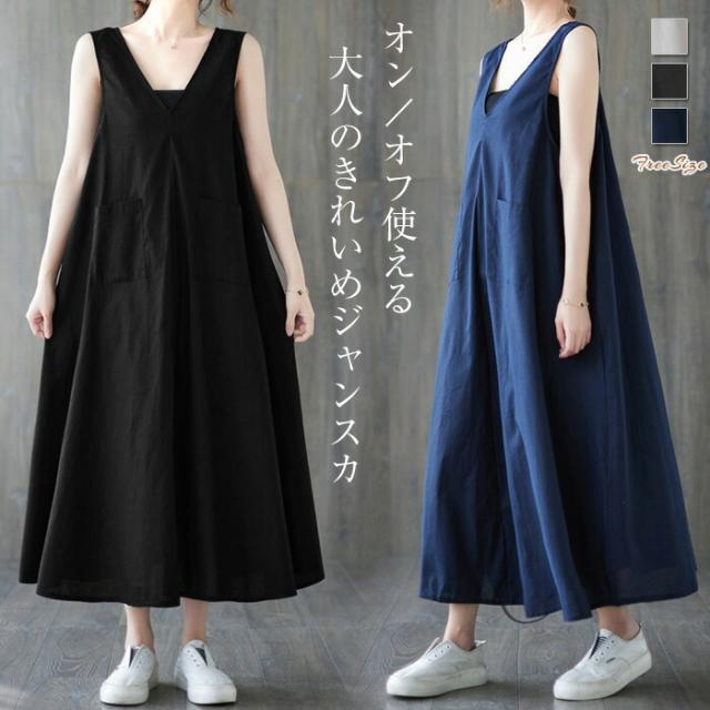 ジャンパースカート サロペット ワンピース ロング 春 夏 レディース 体型カバー おしゃれ ゆったり 無地 Aライン レトロ フレア ポケット付 ノースリーブ レイヤード カジュアル フェ Vネック