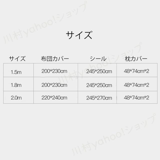 | サイズについての説明 | 商品内容: 布団カバーx1/ベッドシーツx1/枕カバー x2 ※寸法は多少の誤差がある場合がございます。 |