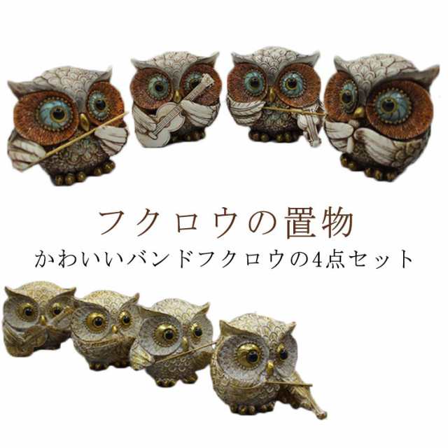 | かわいいバンドフクロウの4点セット ふくろうの仕草、表情など、良く作られていて雰囲気抜群です。 ちょっとしたお部屋のアクセントに、玄関やガーデニングの置物として 細部まで拘った作りで本物趣向の方にも満足出来る世界を演出しています。 | |