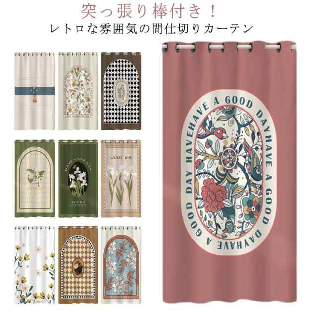 | 突っ張り棒付き!レトロな雰囲気の間仕切りカーテン 取り付けも簡単!つっぱりポールやのれん棒を通すだけ! お部屋、キッチンの出入り口に、洗面スペースの間仕切りはもちろん、やデッドスペースを生かして洋服の収納などにもオススメです。 省エネ対策にもなり、ちょっとした間仕切りや目隠しなど様々な場所で大活躍! | |