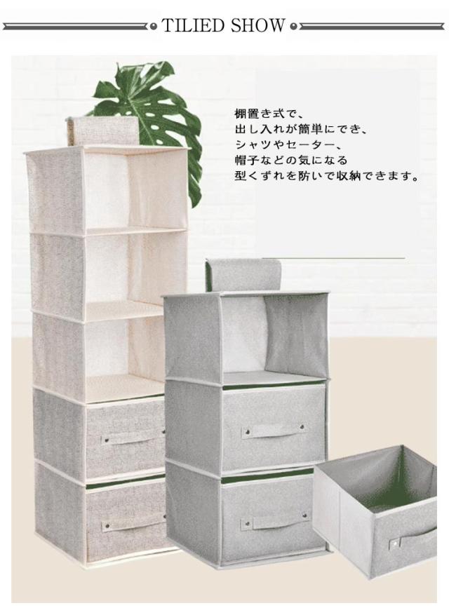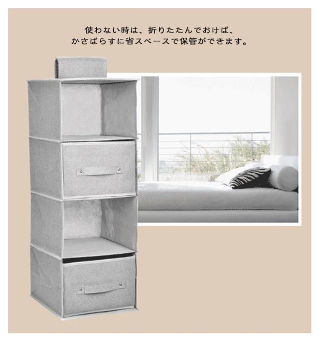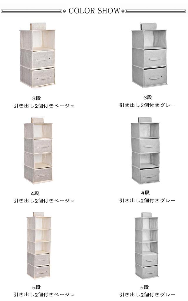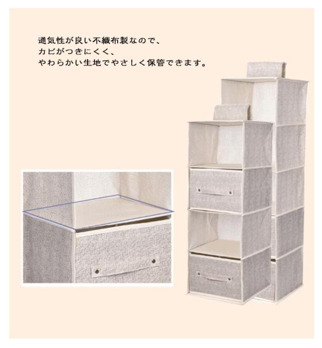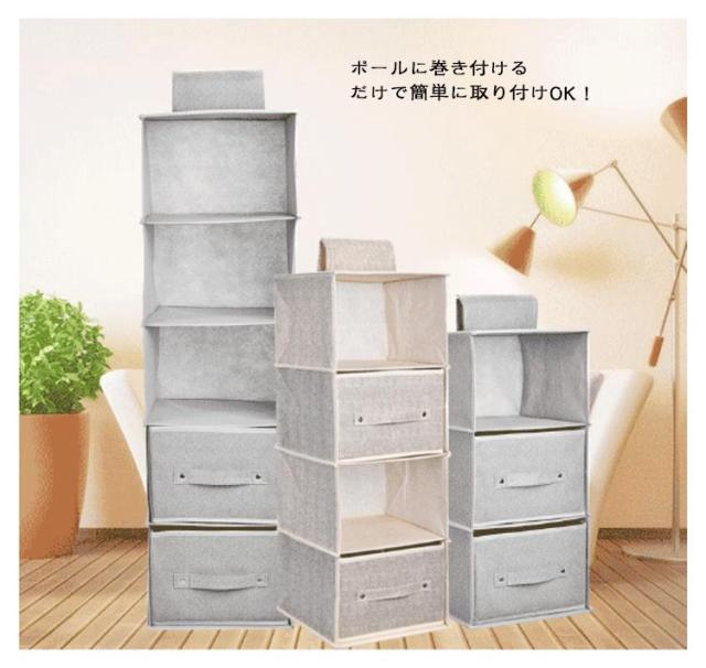| 3/4/5段選べる! 引き出し2個付きの吊り下げ収納ラック 棚置き式で、出し入れが簡単にでき、シャツやセーター、帽子などの気になる型くずれを防いで収納できます。 使わない時は、折りたたんでおけば、かさばらすに省スペースで保管ができます。 ポールに巻き付けるだけで簡単に取り付けOK! 通気性が良い不織布製なので、カビがつきにくく、やわらかい生地でやさしく保管できます。 | |