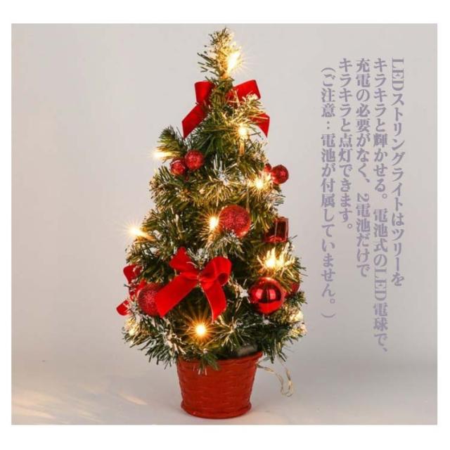| 卓上クリスマスツリーはクリスマス飾りの定番商品として、クリスマス雰囲気を演出して、活気が溢れています。 どこにでも置きやすいミニサイズのツリーなので、テーブルの上や玄関などちょっとしたスペースに飾れます。 LEDストリングライトはツリーをキラキラと輝かせる。電池式のLED電球で、充電の必要がなく、2電池だけでキラキラと点灯できます。(ご注意:電池が付属していません。) | |