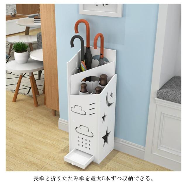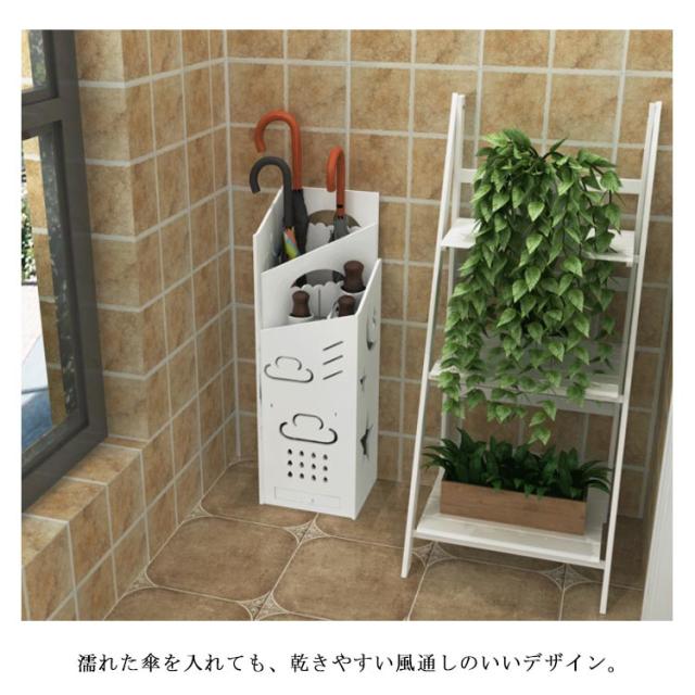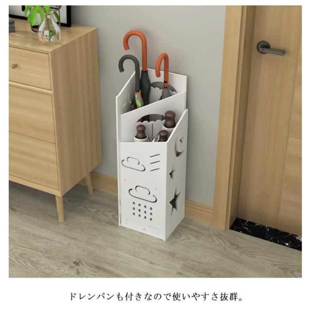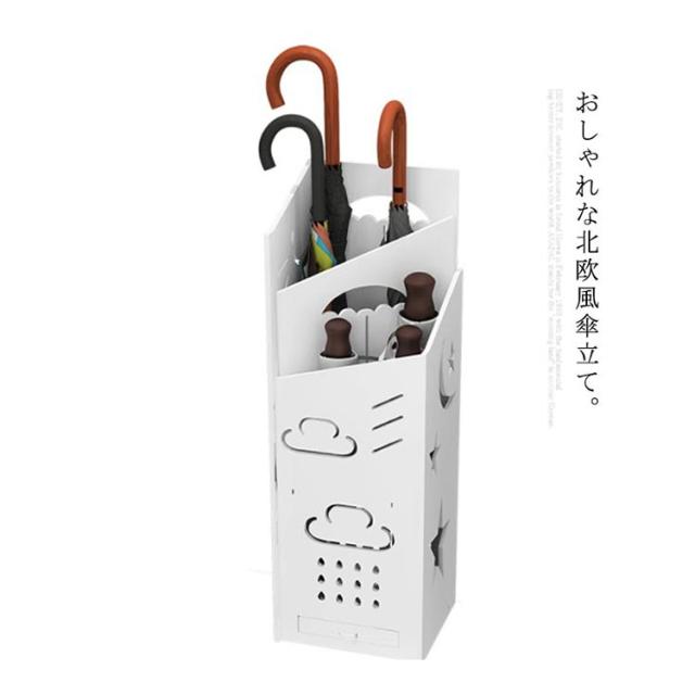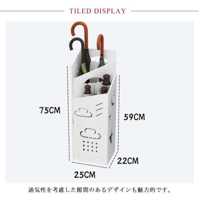 | おしゃれな北欧風傘立て。 通気性を考慮した隙間のあるデザインも魅力的です。 濡れた傘を入れても、乾きやすい風通しのいいデザイン。 長傘と折りたたみ傘を最大5本ずつ収納できる。 ドレンパンも付きなので使いやすさ抜群。 コンパクトな作りで傘立てを置くスペースのない狭い所にも設置でき、省スペースに。 | |