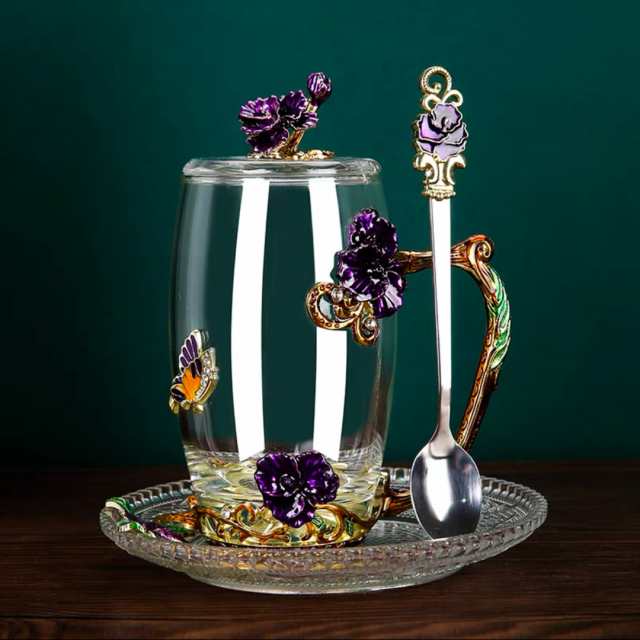 紫バラ花柄 ガラス製 .ティーカップ 4点セットコーヒーカップ