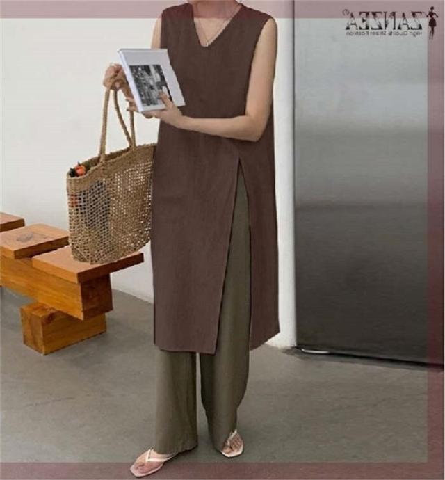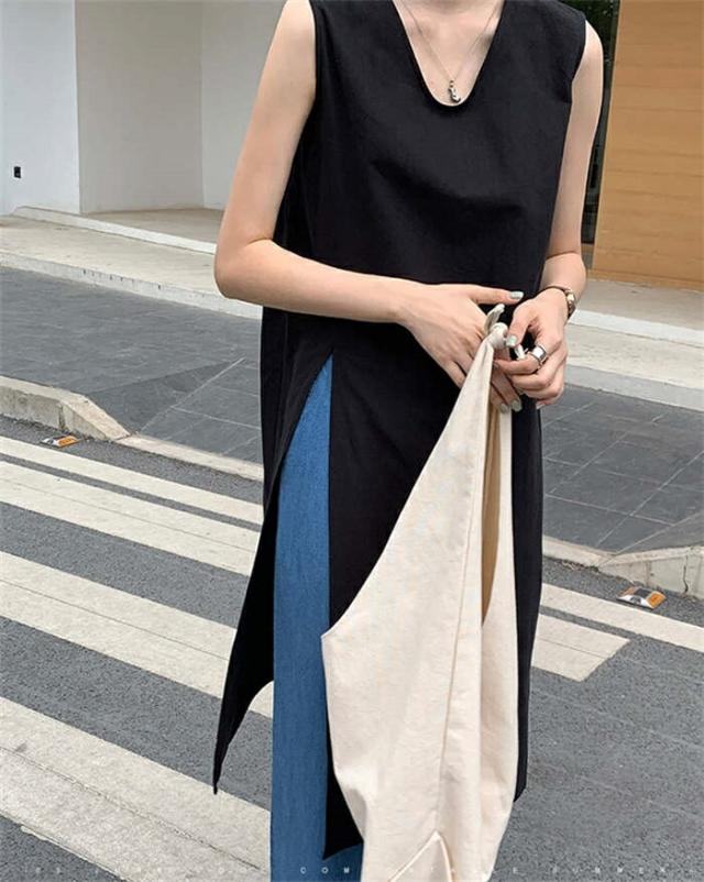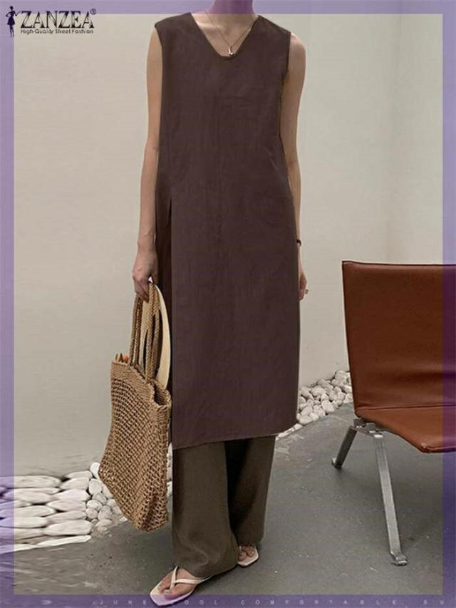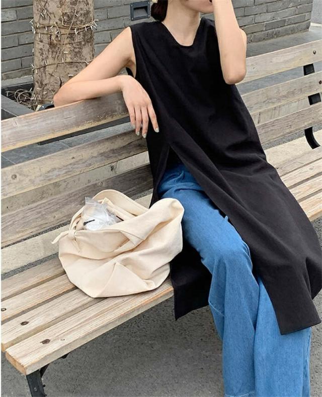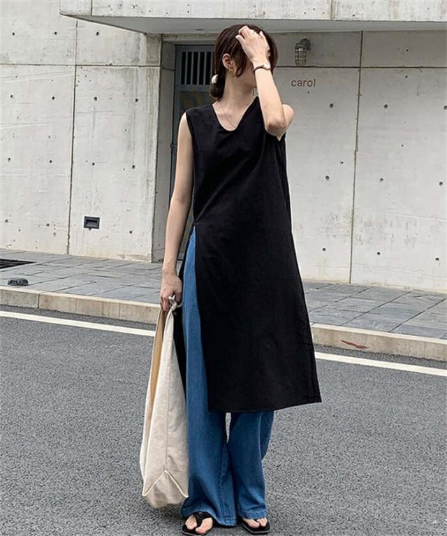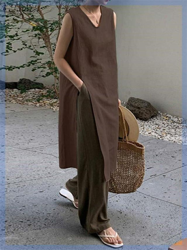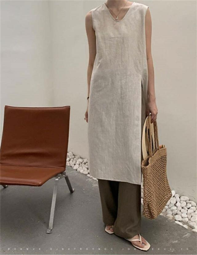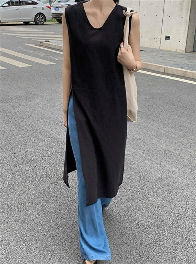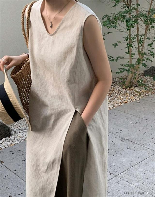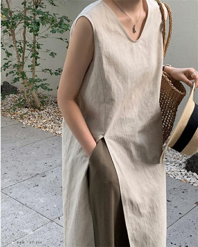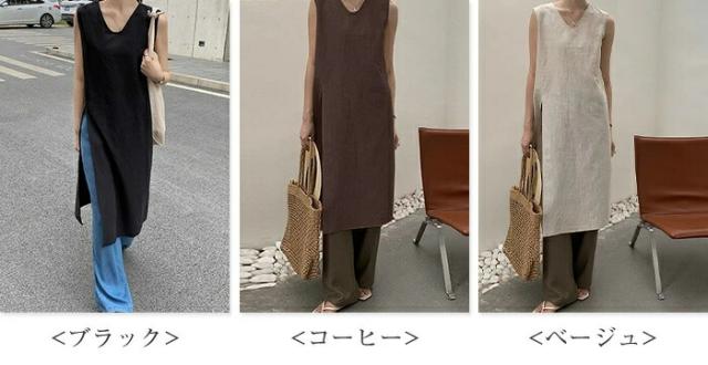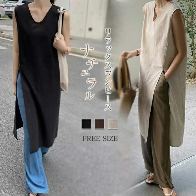 ワンピース ノースリーブ タンクトップ カットソー 春 夏 レディース Vネック スリットワンピ チュニック インナー ノースリーブワンピース 綿麻 コットン 上品 カジュアル おしゃれ 体 スリット