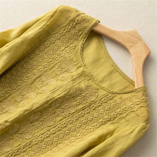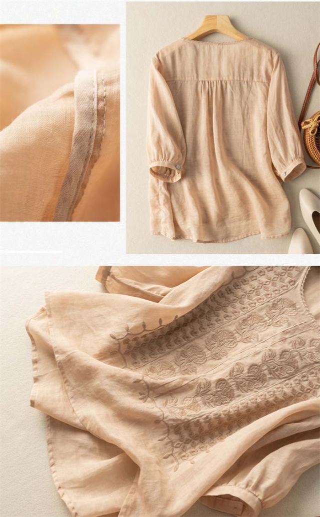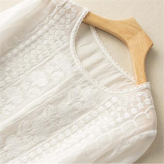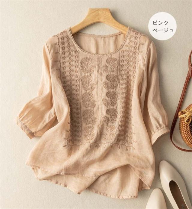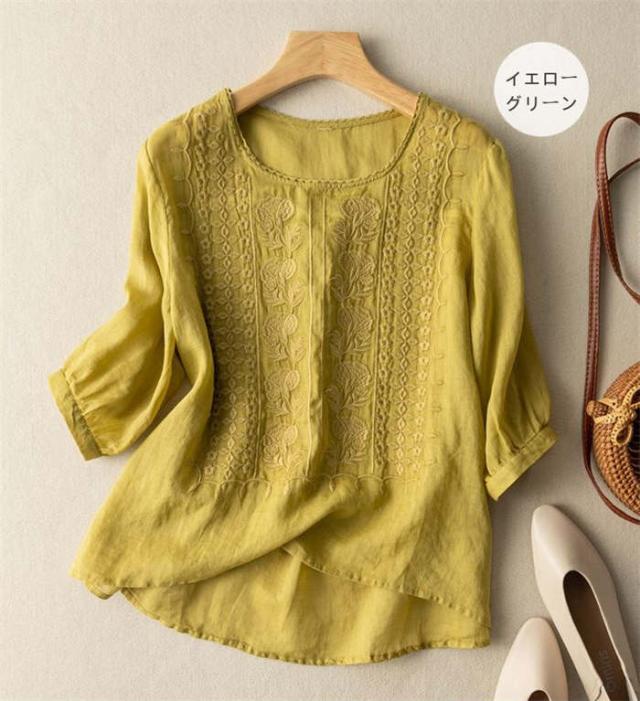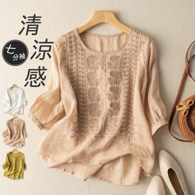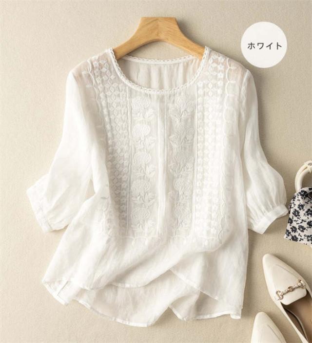 シャツ レディース 夏 7分袖 5分袖 トップス ブラウス 綿麻 リネン コットン 刺繍 カットソー 白シャツ 七分袖シャツ シャツブラウス 綿麻風 薄手 ショート丈 クルーネック UVケア 涼しい