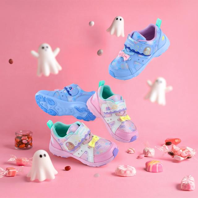 「こどもの足にいいことぜんぶ」の想いから生まれた機能シューズ「ムーンスター キャロット」のキッズシューズです。脱ぎ履きしやすいゴム紐×バンドタイプです。おばけのナイトパーティをテーマに、ゆるかわお化けたちがスイーツを囲んで楽しくパーティしている様子を表現しました。甲バンドには膨らんだぷにぷにおばけと、正面のゴム紐にはリボンをあしらいました。子どもの足の成長をサポートする「4つの機能(つま先ゆったり/カウンターボックス/フレックスジョイント/洗えるインソール)」に加え、中敷きにはサイズ選びに役立つ「サイズめやす...
