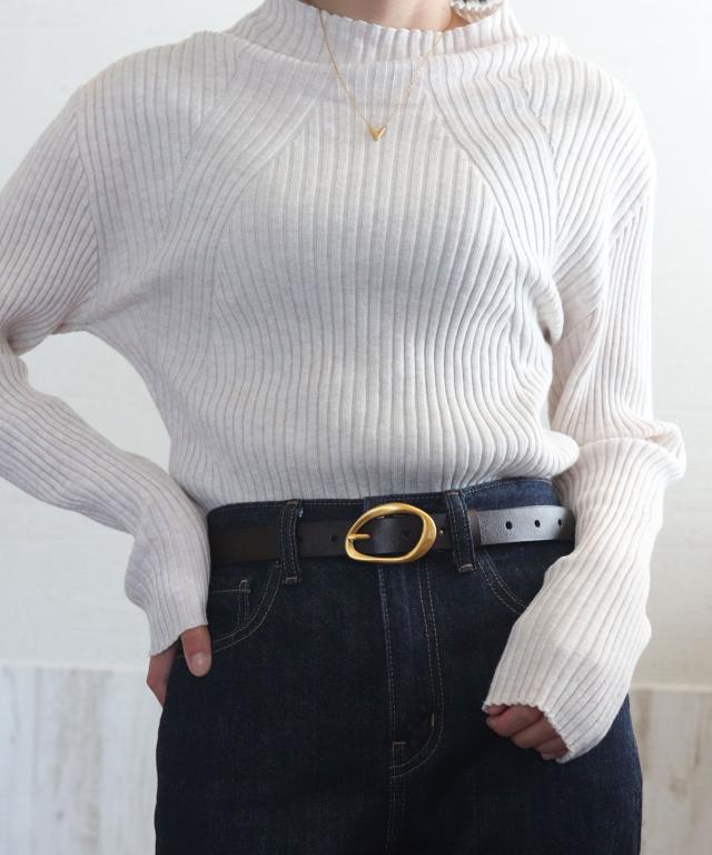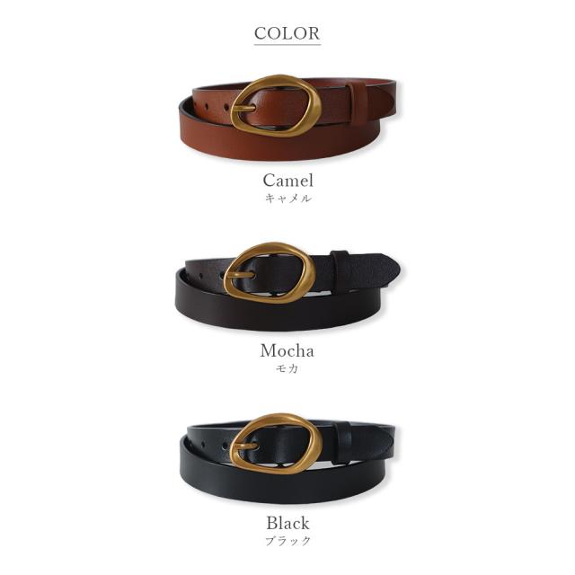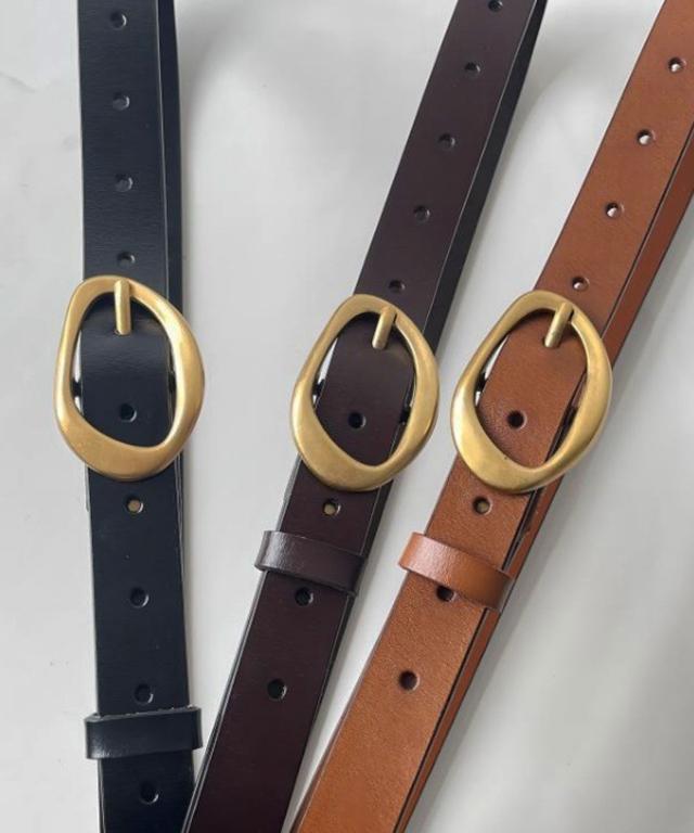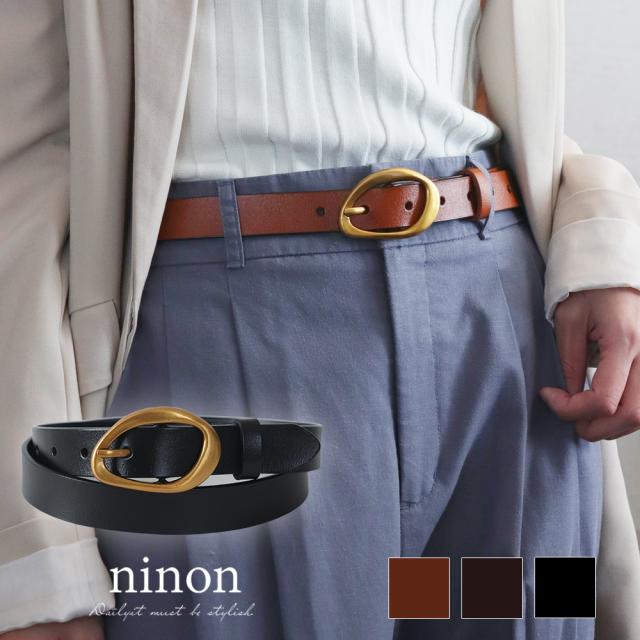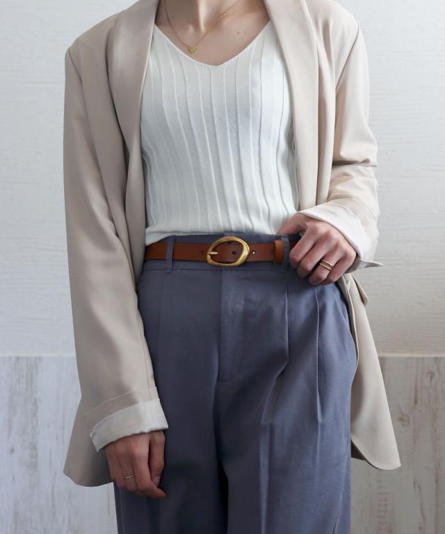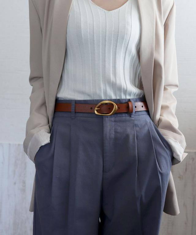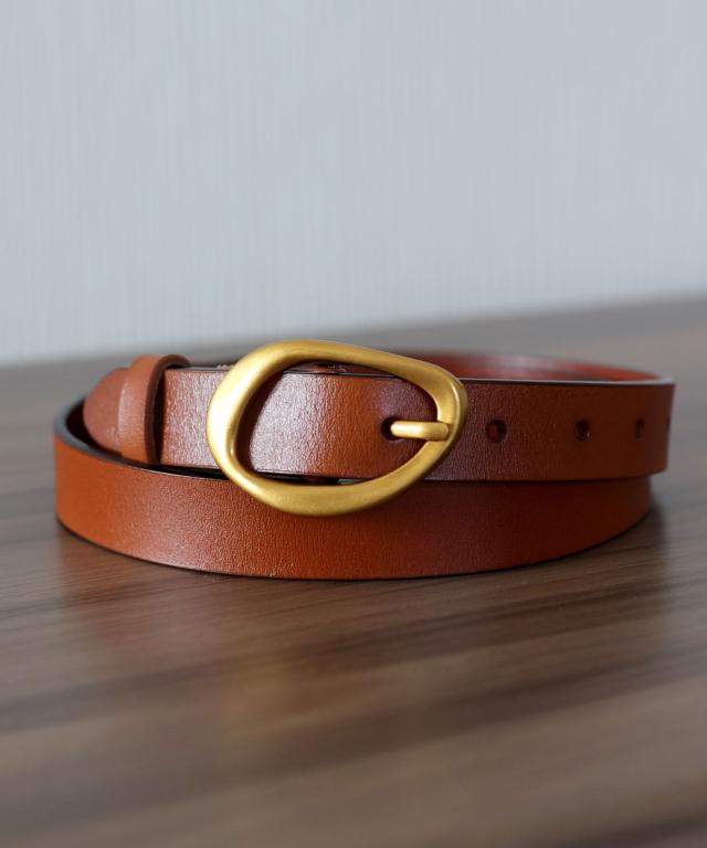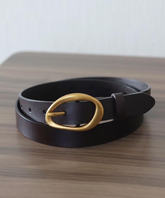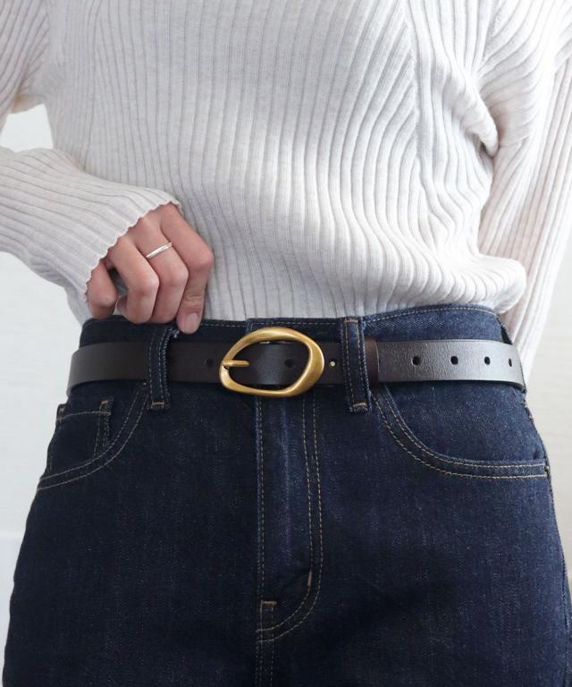 アンティークゴールドの歪んだリングバックルが、大人のこなれ感をプラスするスタイリッシュなベルトです。