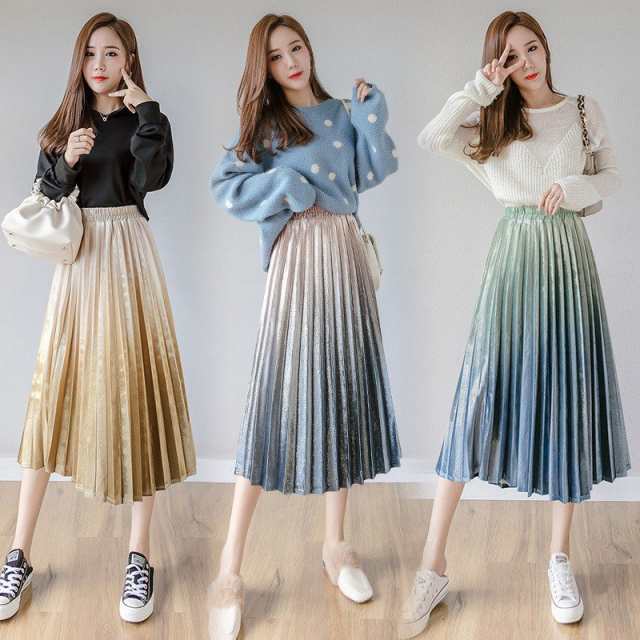 プリーツスカート ミモレ丈 ロング丈 グラデーション スカート ピンク 星空 春 秋 冬 無地 30代40代50代