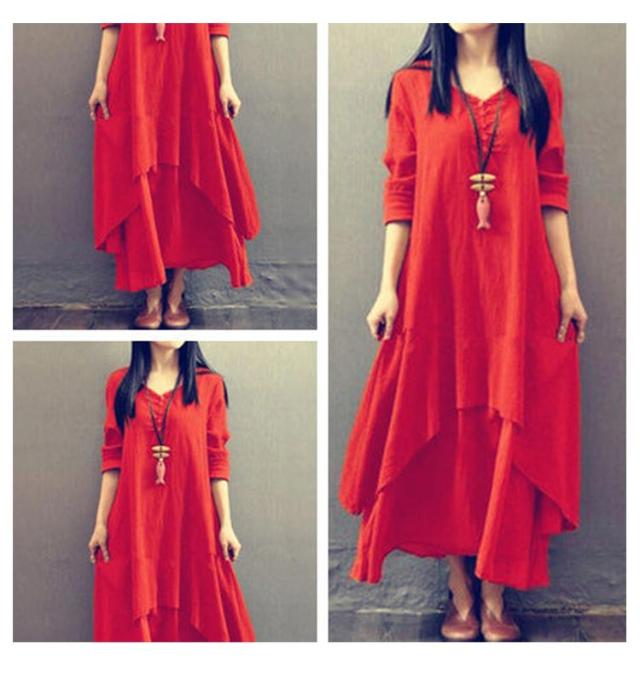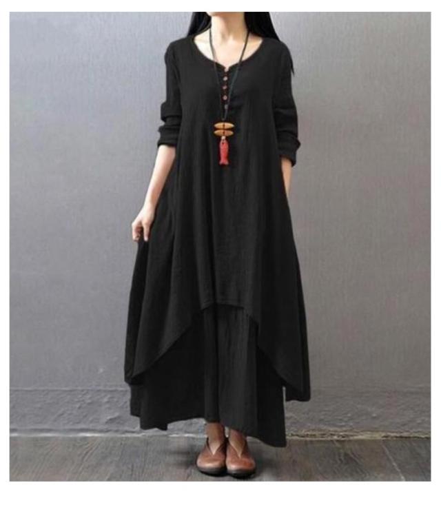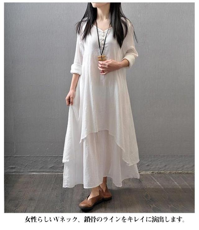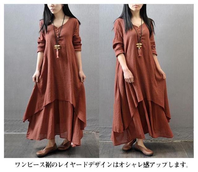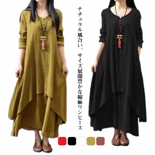 【送料無料】ワンピース 春 長袖 綿麻ワンピース リネン Aライン レディース ロング丈ワンピース 森ガール系 ゆったり 無地 春 秋 爽やか 薄手 涼しい コットンとリネン レイヤード エレガント 体型カバー 着痩せ カジュアル きれいめ 20代 30代 40代