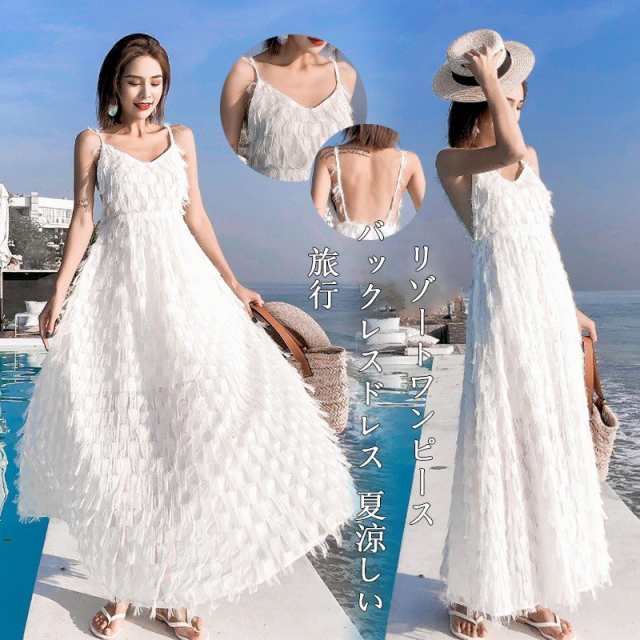 バックレスドレス 旅行 リゾートワンピース 海 ロング丈 ワンピース ビーチ 吊りワンピース 夏涼しいセクシー 羽毛 タッセル リゾート 体型カバー スリム
