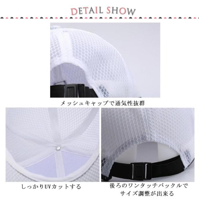 | メッシュキャップで快適に紫外線カット・日除け。 通気性抜群で、速乾素材を使用しているためアウトドアや、スポーツにも最適です。 しっかりUVカットするので紫外線対策にも。 後ろのワンタッチバックルでサイズ調整が出来るので男性でも女性でもユニセックスで着用可能です。 | |