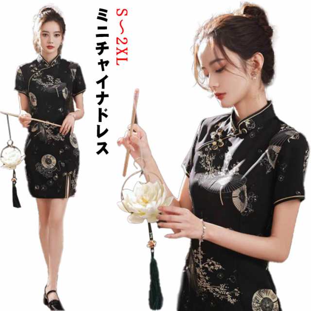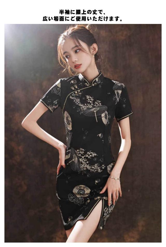送料無料 チャイナドレス 半袖 中華風 ワンピース 演出 中華楽器 パーティー ドレス 女性用 ミニチャイナドレス ショート丈 チャイナ服 セクシー 中華ドレス 華流コスチューム タイト 膝丈 ハロウィン パーティー チャイナ舞台衣装 ブラック