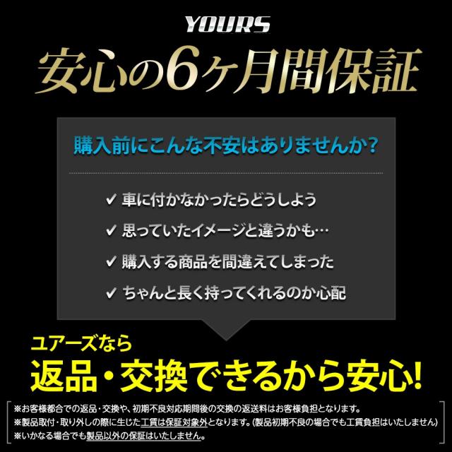 | ■本製品をお車に設置する際、取付向きが間違え無い事を確認した上で取付を行ってください。 ■作業時の破損やキズ、事故等につきましては保証は一切いたしません。 ■周辺機器や取り付け工賃など、商品以外の保証は一切いたしません。 また、分解・改造されております場合も保証対象外となりますので、分解・改造をされないようにしてください。 |