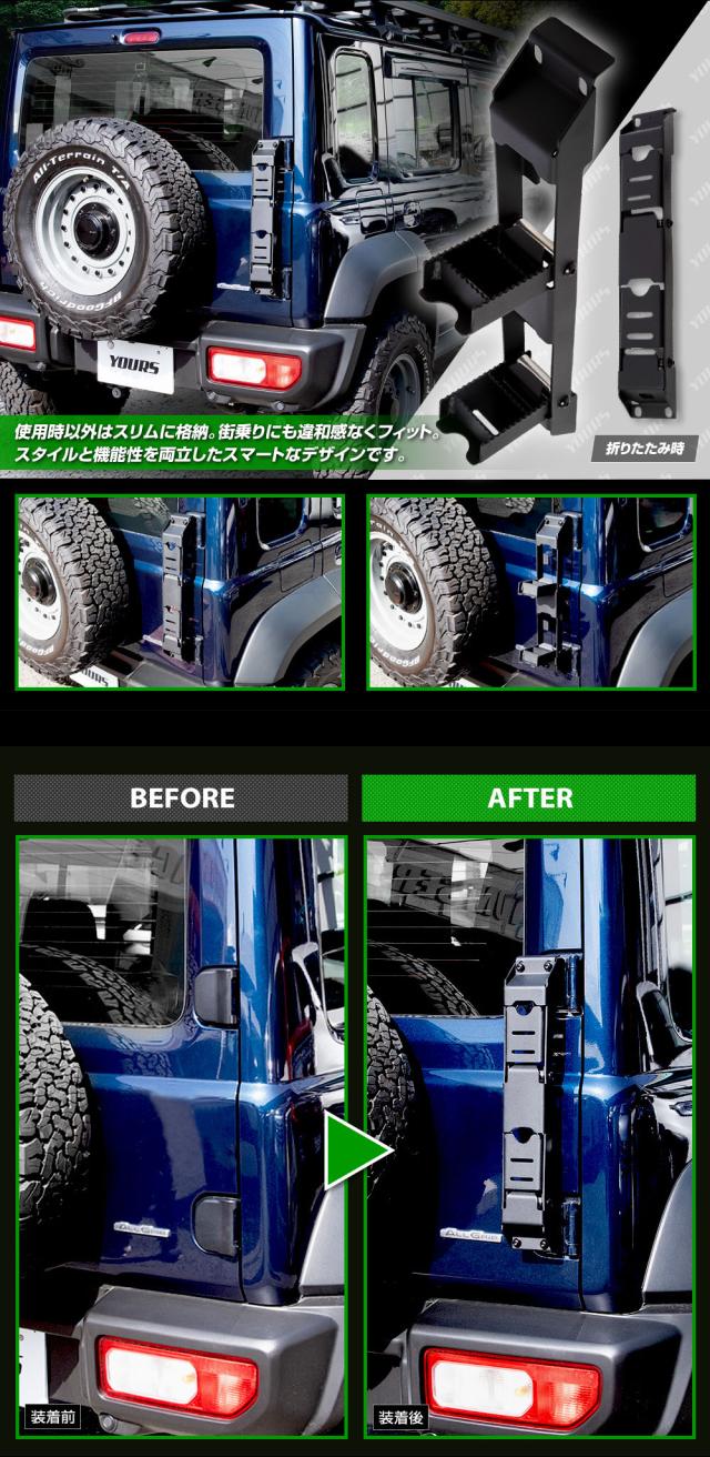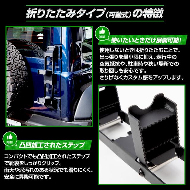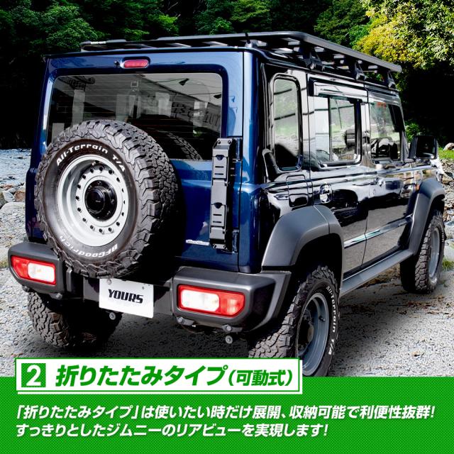 | ジムニー ノマド専用設計で、ボルト固定により面倒な加工は不要。 高耐久・軽量、防錆・つや消し仕上げの素材を採用。 【選べる2タイプ】 固定式 しっかりとした装着で、ルーフキャリアへのアクセスが快適(アルミ製)。 折りたたみ式 未使用時にコンパクトに収納でき、見た目もスマート(スチール製)。 滑り止め加工で安全性も確保。マットブラック仕上げがジムニーの無骨なスタイルにマッチし、後方視界も妨げません。 機能性・デザイン性・安全性を兼ね備えた、ユアーズおすすめアイテムです! |