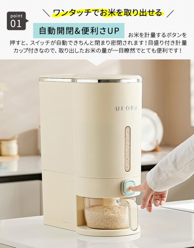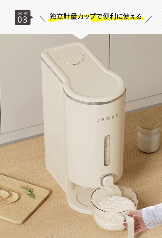 - 使ってみると、とても便利です。計量機能が付いており、必要な量の米を簡単に取り出すことができます。透明な素材で中身が一目瞭然で、米が少なくなったことがすぐに分かります。価格もリーズナブルで、コスパが高い...